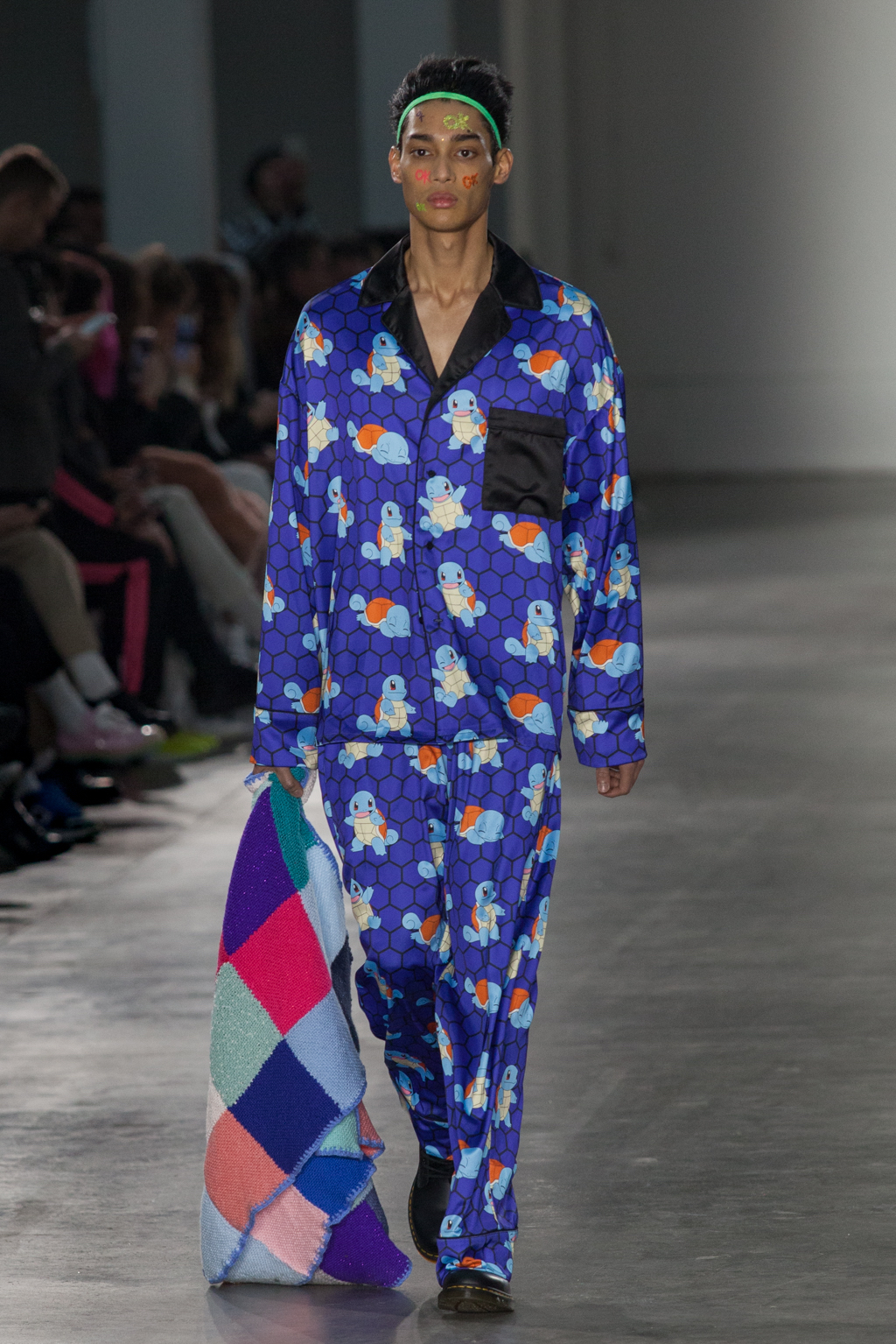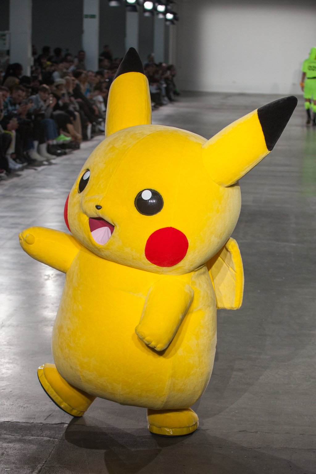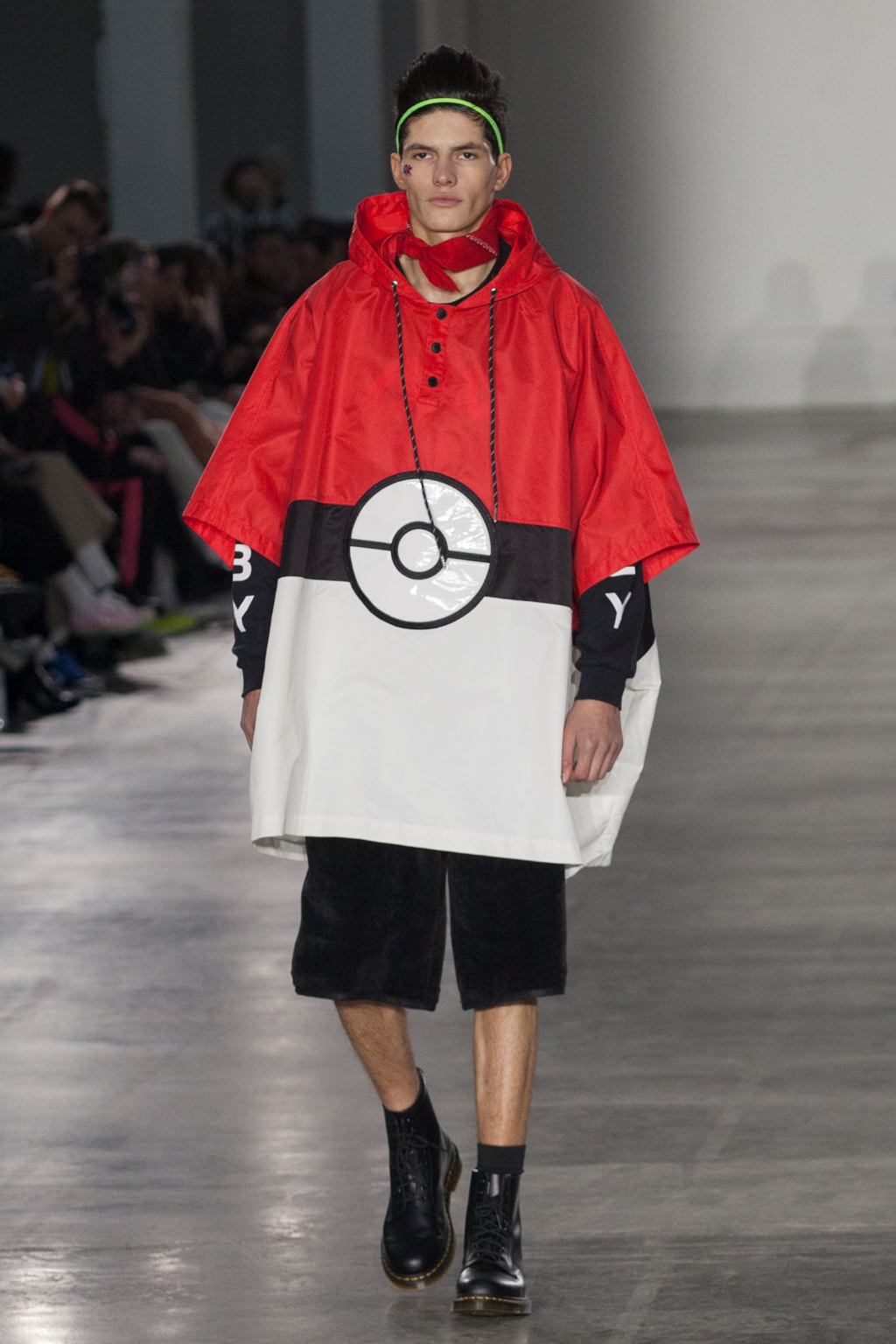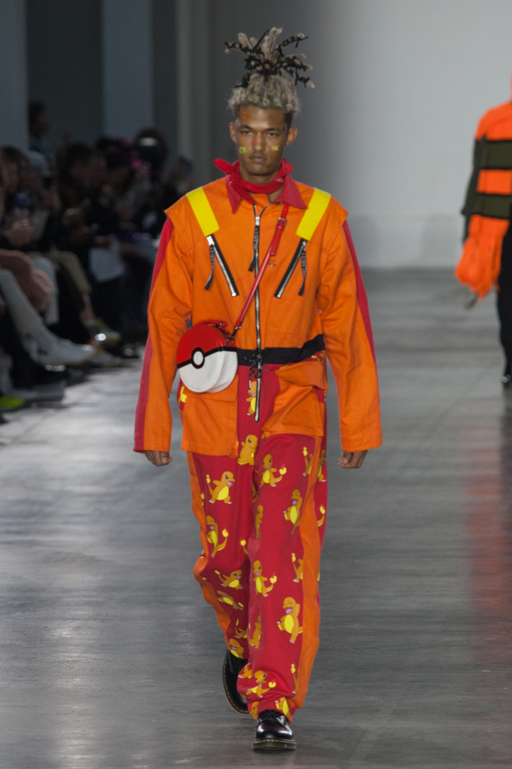 The rest of the show was a vivid recollection of Abley’s favourite characters from Pokemon. The fiery combination of orange, red and yellow of Charmander, soft feminine lilac of Mewtwo, powdery blues of Squirtle and of course, the distinctive sunshine yellow of Pikachu was sure to give anyone who lived in Pokemon’s heyday a jolt of nostalgia. These colour schemes appeared throughout the collection, as did the characters themselves in repeat motifs. Elsewhere, The iconic Poke Ball was interpreted as a technical poncho, oversized polo shirt, backpack and cross-body bag.