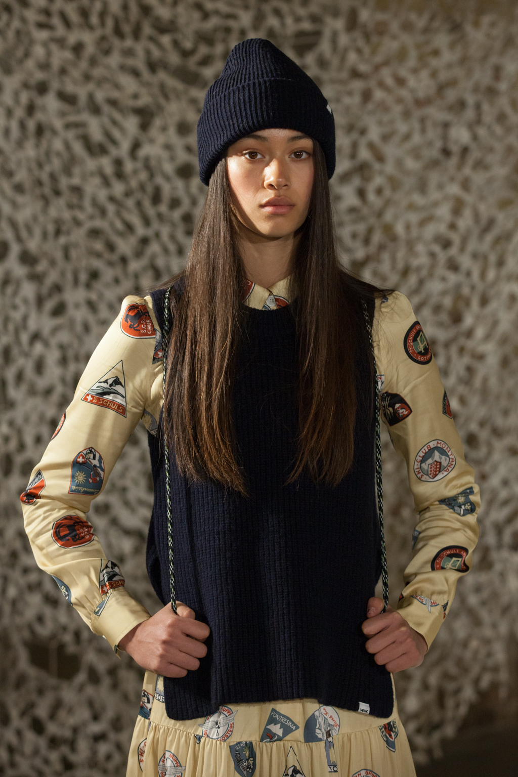 The alpine theme was thoroughly depicted through rich print stories, details and coniferous colours, creating a nostalgic skiwear aesthetic. Sporty jerseys, inspired by skiing underwear, and ribbed wool ear warmers were just some of the elements that indicated the strong wearability of the collection.