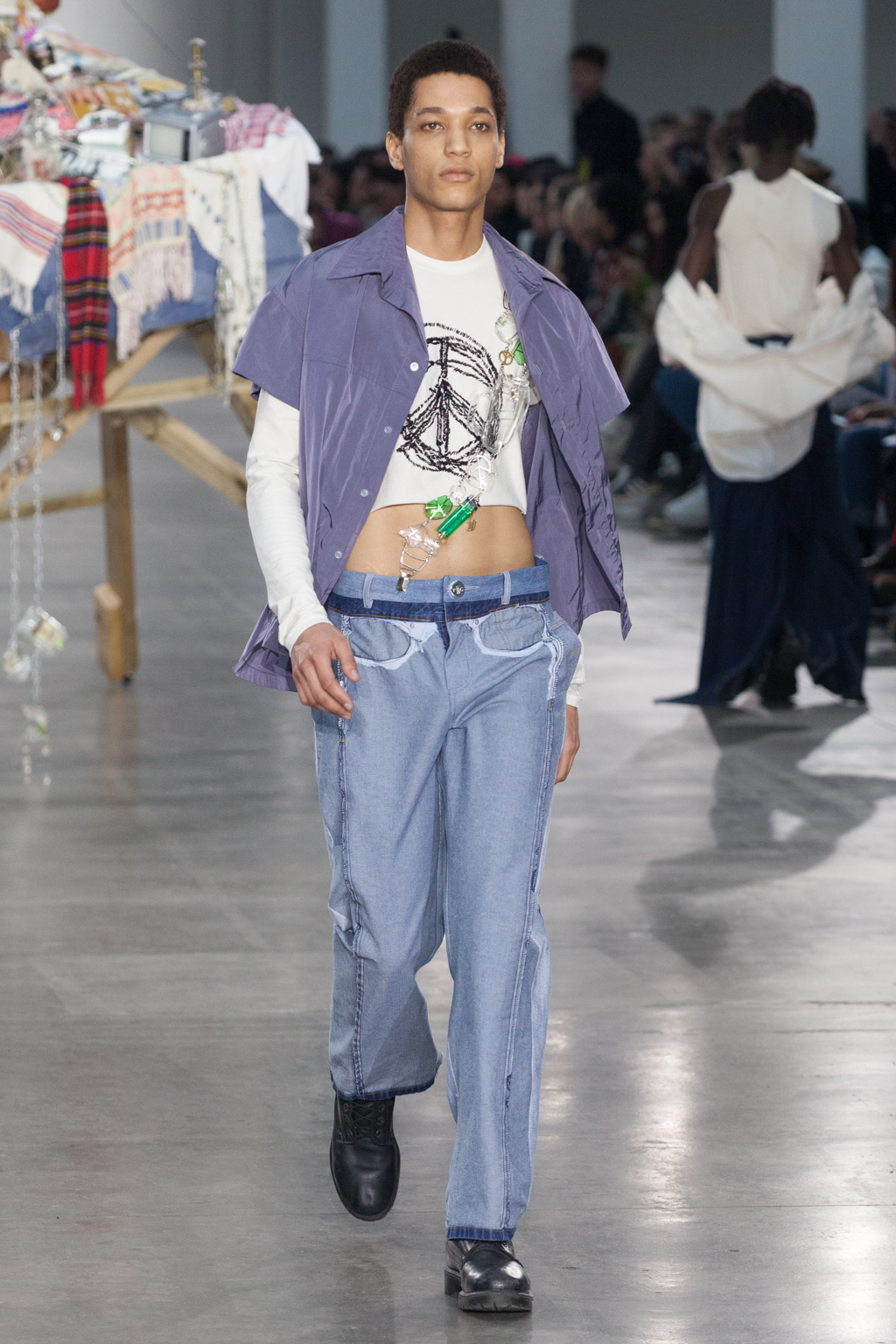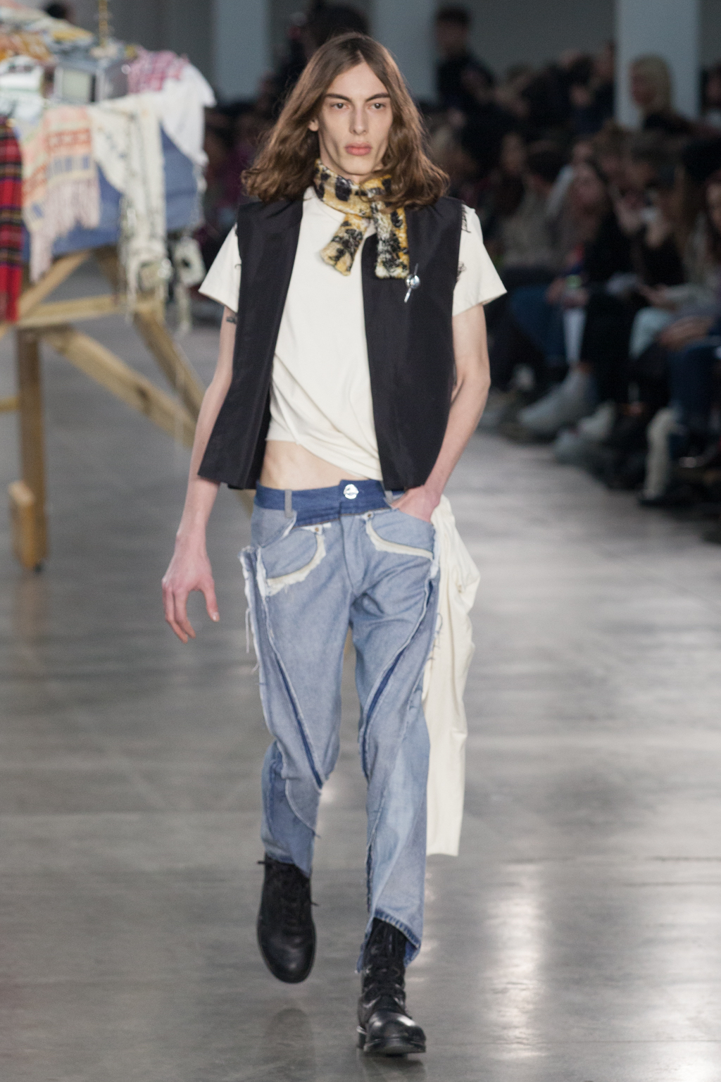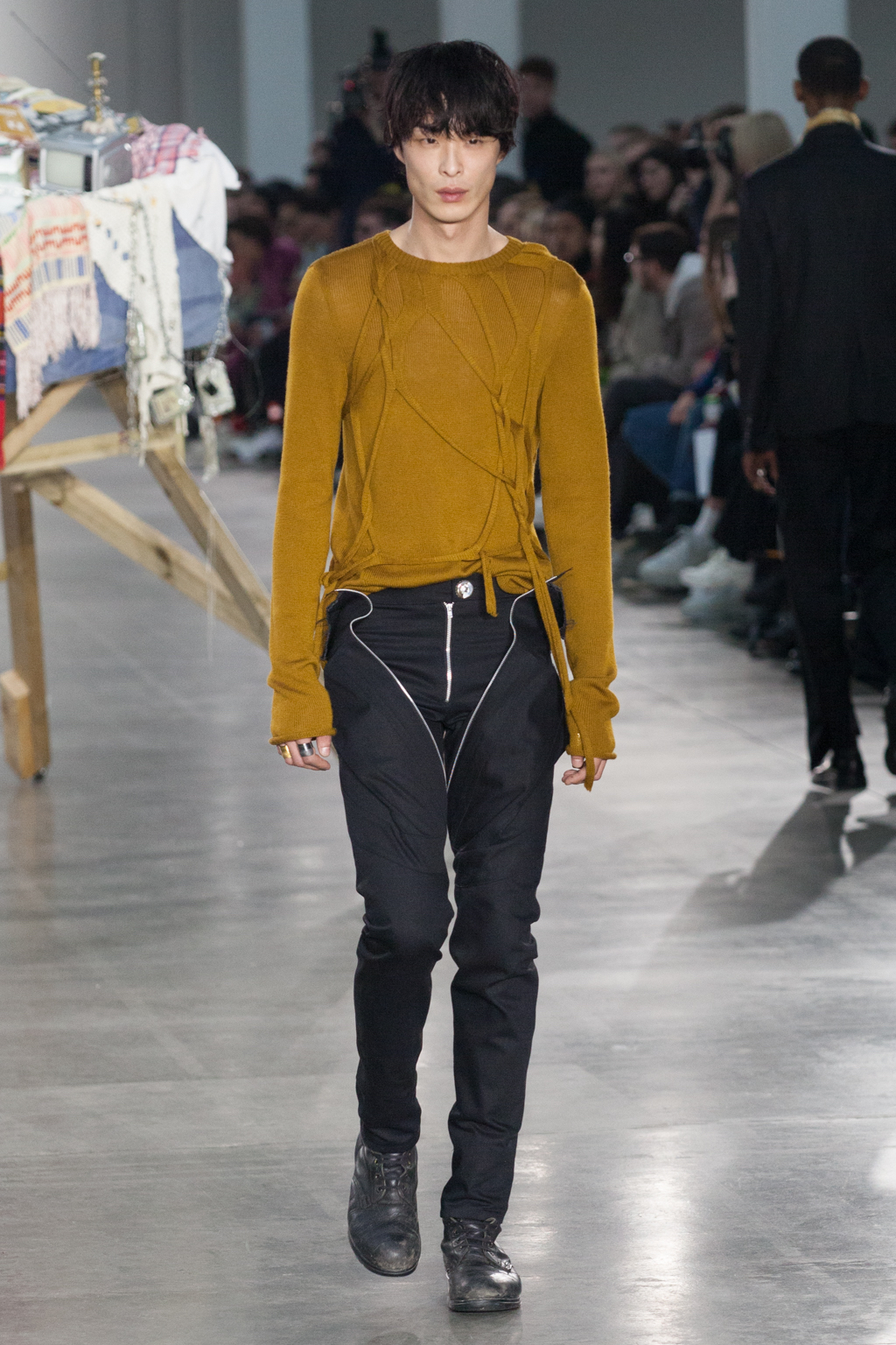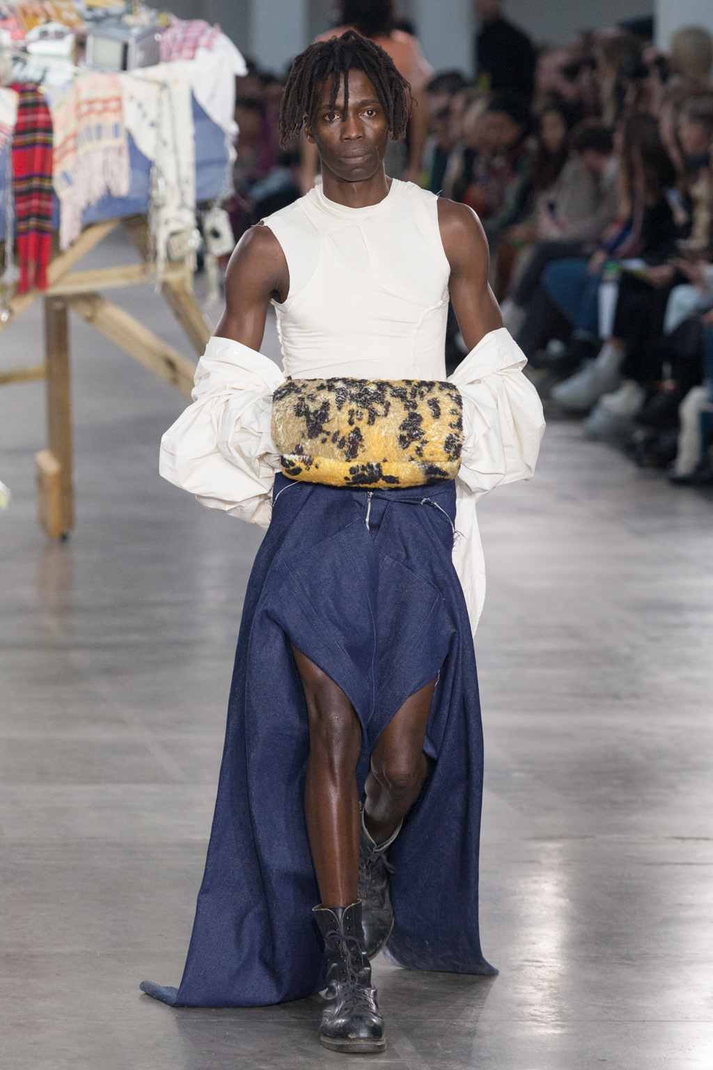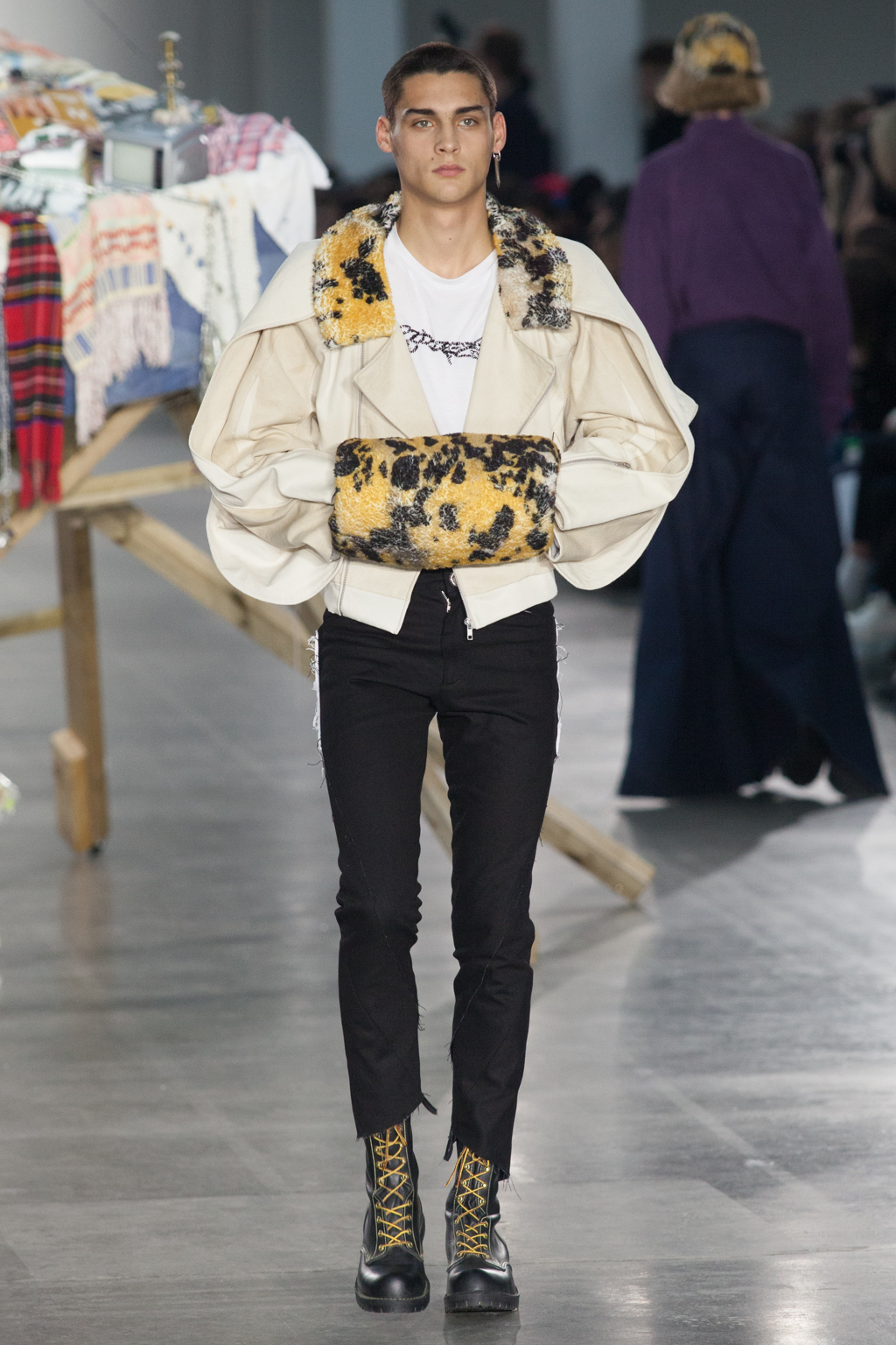 From apricot to dusty lavender to dove white, Götesson’s colour palette was soft and gentle – refreshing, given the usual deep autumnal tones that other designers tend to opt for. This allowed a stronger focus on the unexpected design features: crew-neck jersey t-shirts either had an extended tail or fabric, or were cropped or twisted, exposing the body as though it was attempting to break free. The classic anatomy of the denim jean was warped; they turned inside out, showing a combination of different washes and unfinished edges, while another pair was joined with multiple seams twisting down the leg.