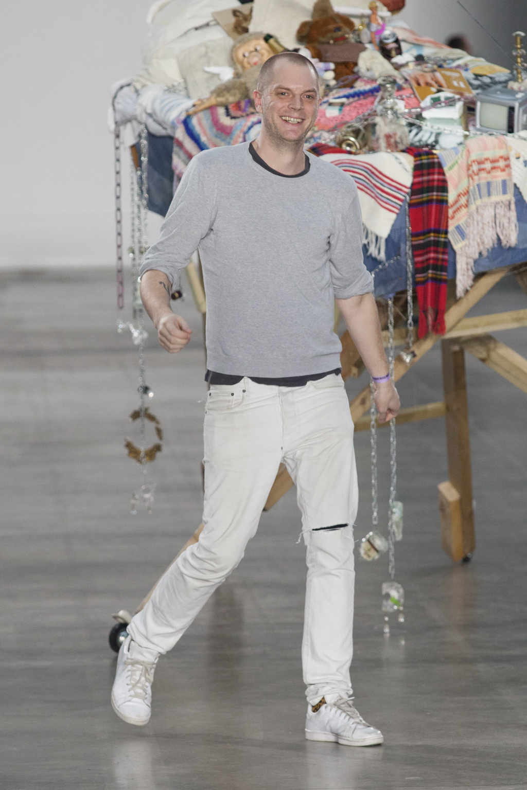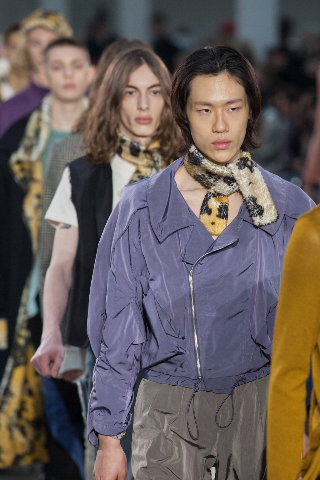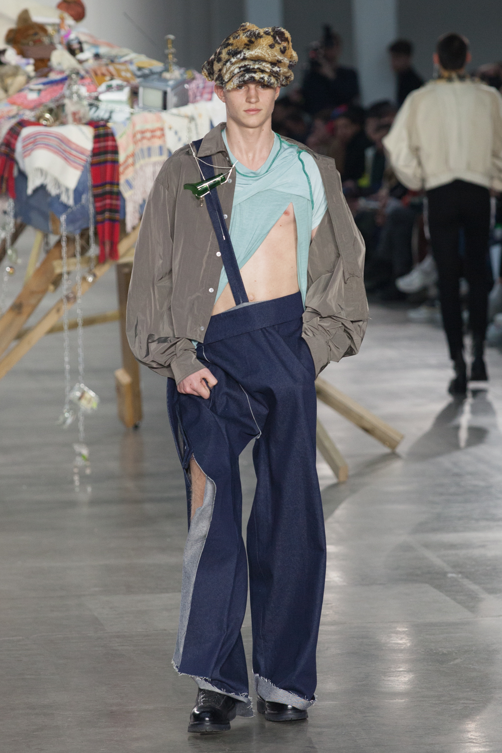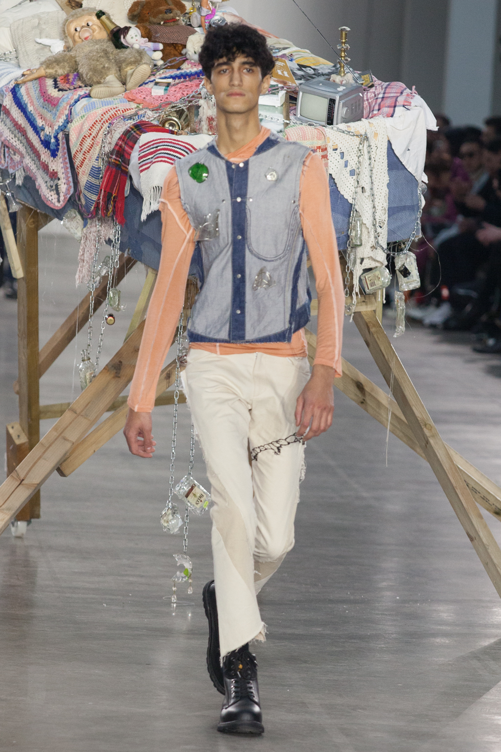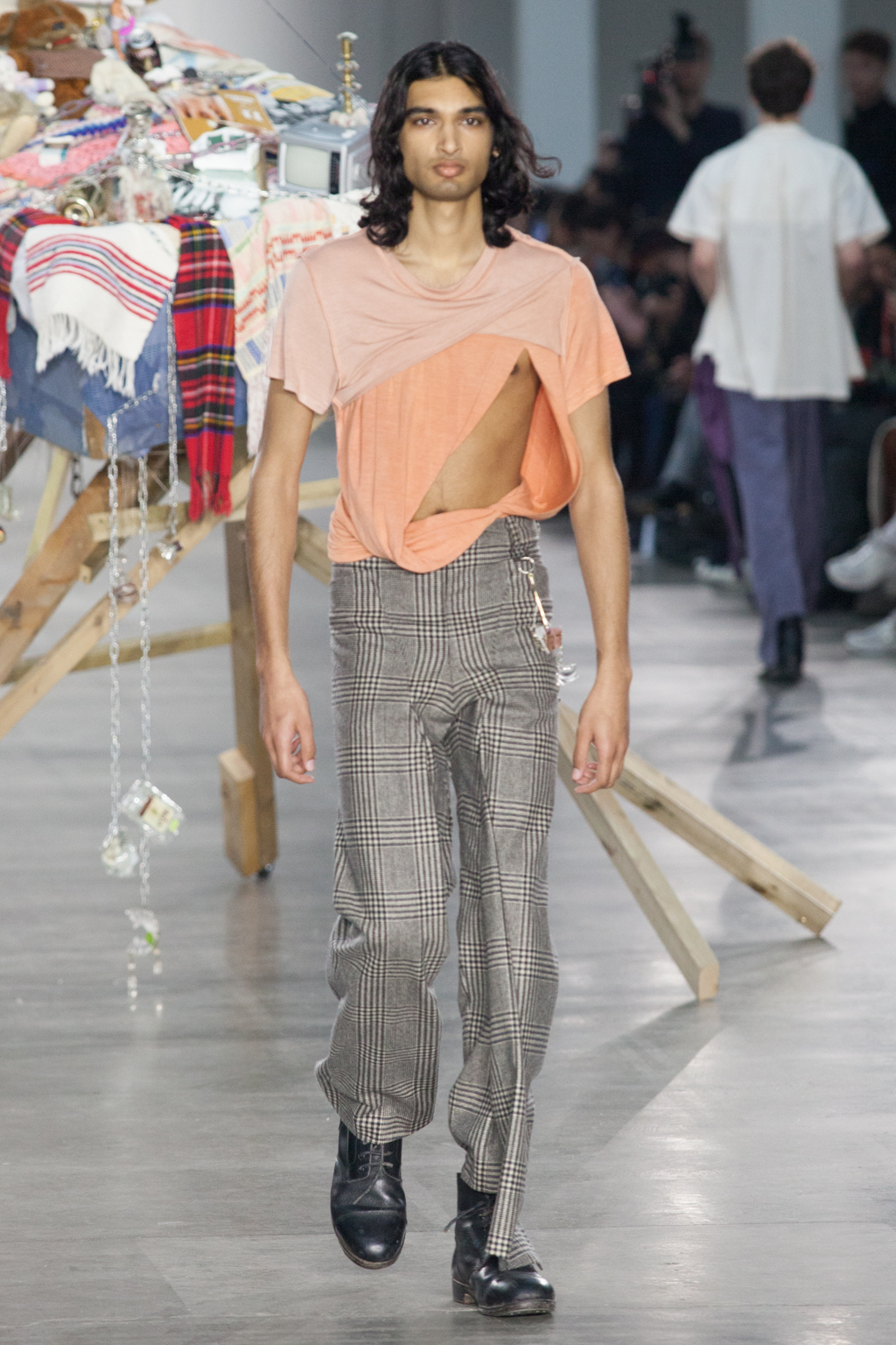 From apricot to dusty lavender to dove white, Götesson’s colour palette was soft and gentle – refreshing, given the usual deep autumnal tones that other designers tend to opt for. This allowed a stronger focus on the unexpected design features: crew-neck jersey t-shirts either had an extended tail or fabric, or were cropped or twisted, exposing the body as though it was attempting to break free. The classic anatomy of the denim jean was warped; they turned inside out, showing a combination of different washes and unfinished edges, while another pair was joined with multiple seams twisting down the leg.