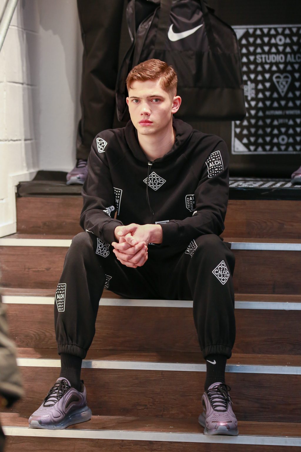 The range was heavily inspired by the textures, motifs and visuals found on the daily urban commute in and around London, for instance with some pieces mimicking the indented pattern of manhole covers. Frequent collaborator Nike teamed up with the label to provide footwear for the presentation.