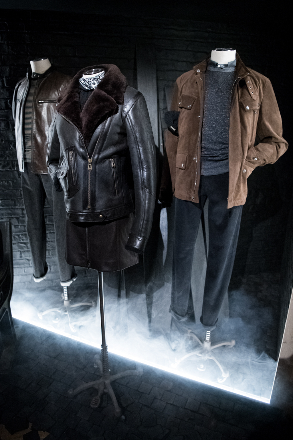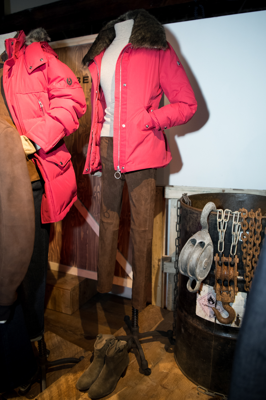 The second compass-point was the “Dockland”, which intertwines with the Navy, as Belstaff was well-known for making military uniforms and protective kit. In a place where ropes, pulleys and chains are dominating the scene, Belstaff brought silver and olive to their new collection, besides the old navy and dark indigo tones – the key fabric being Melton wool. At the Dockland compass-point, the emphasis was on modernisation, bringing two classics up to date: the Indigo Racemaster and Indigo Trailmaster jackets which were reimagined and rinsed, featured in dark, modern denim.