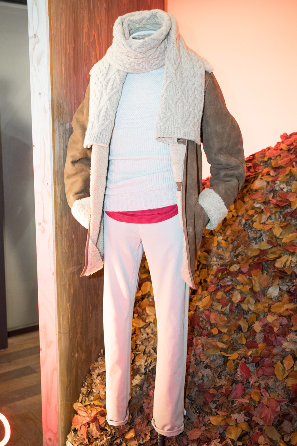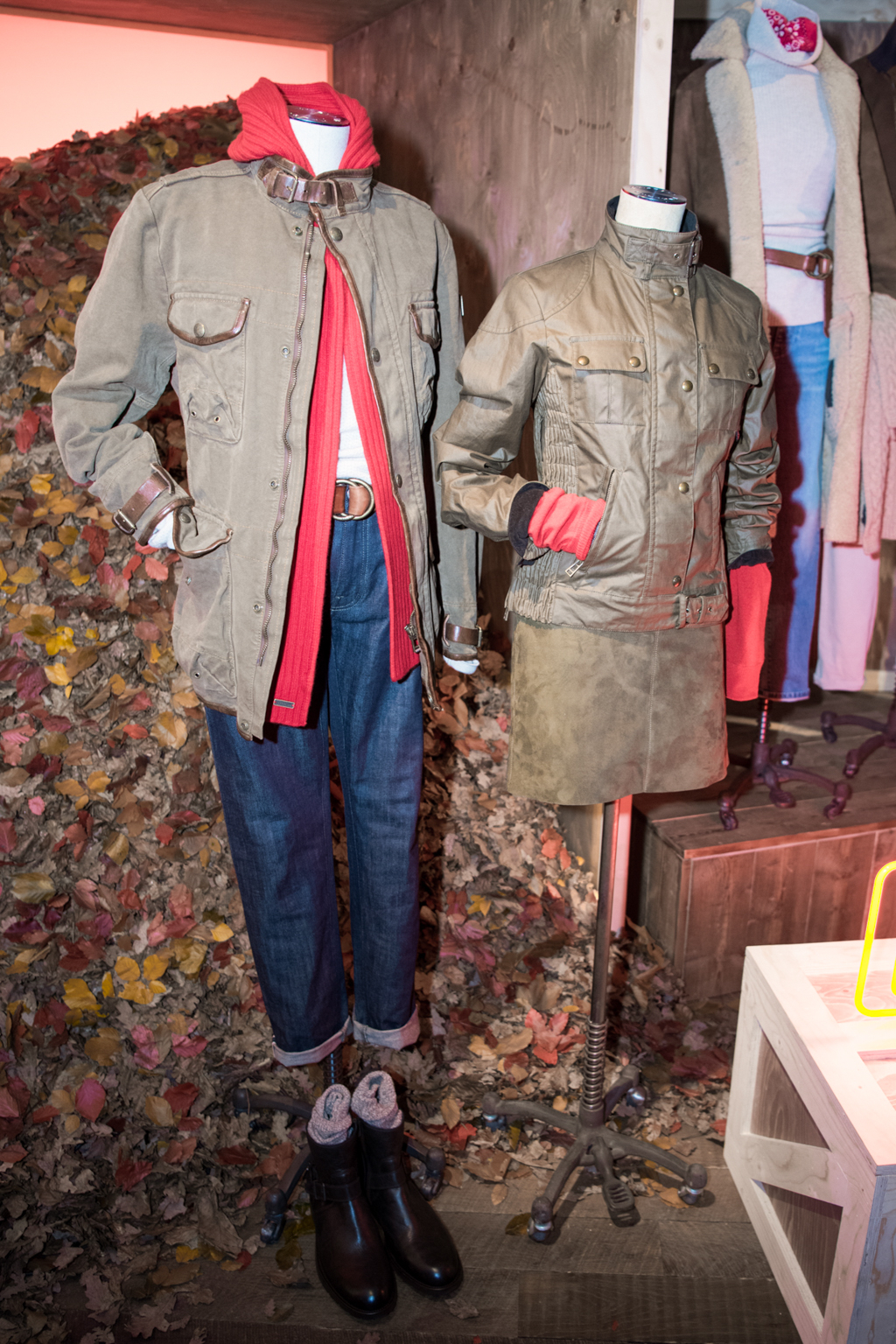 The first setting was the “Outward Bound”, a scene extracted from the 1920s, when Belstaff was most affiliated with the world of hiking, camping and exploration, creating mostly protective and waterproof travelling gear designed in partnership with the mountaineer Sir Chris Bonington. Today, the sense of exploration remains strong within the brand’s identity; this is why they inaugurated a new Belstaff Red, which was presented against a backdrop of logs and leaves. Here the label featured innovative menswear jackets such as the Wing jacket, which is made out of dry waxed cotton with a canvas feel, the Shearling Car Coat in chestnut and the Journey jacket in broken-in, while for womenswear the attraction is the luxurious Earhart flight jacket in lightweight chestnut suede.