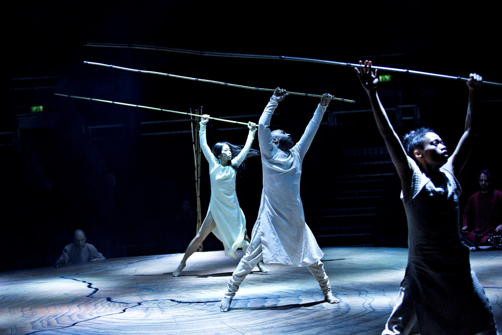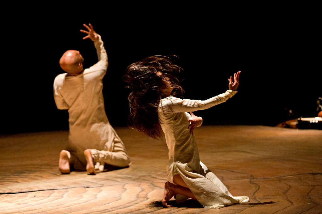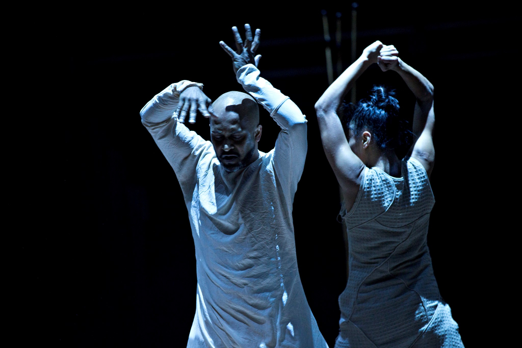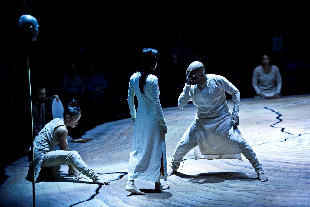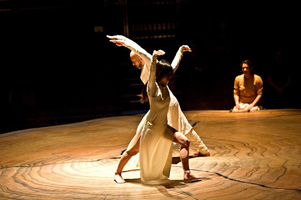 Devised for a 360-degree stage, the production liberates both sound and movement, completely opening up this ancient world to the audience. The performance is immersive in its emotionally charged material and the multiple artistic elements involved. Halfway through, when the show seems to be all about the visual figures created by the dancers, the four musicians along the perimeter of the stage catch the attention with an incredible set of vocals and rousing percussions, terrifically mixed with electro sounds. The setting and the all-encompassing lights from above contribute to creating a suggestive atmosphere – somewhere in between a wood, a desert and a royal palace.