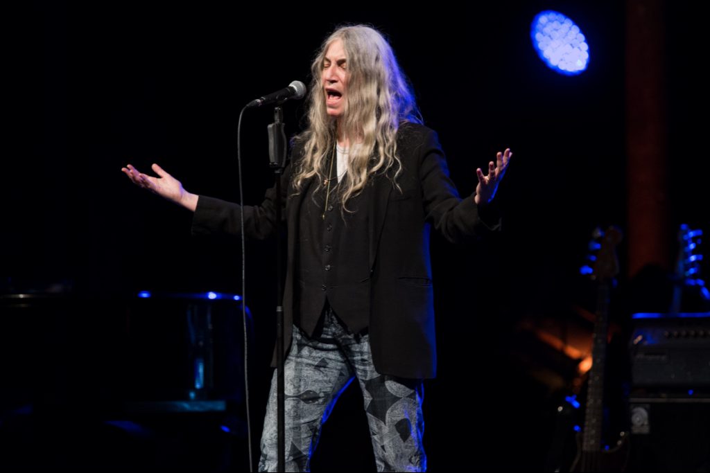 When one envisions the high priestess of punk poetry, certain images and ideas come to mind. We recall accounts describing how she shrieks, spits and howls her way through songs. She is a woman who effortlessly defied all kinds of cultural norms and resuscitated a fading rock and roll scene. She is the woman who recovered from falling on stage at Glastonbury by saying, “I fell on my f**kin’ ass … because I am a f**kin’ animal”. At 72 years old she is still every bit the defiant female and punk-rock icon but now slightly less rough around the edges. Patti Smith’s Words and Music at the Roundhouse delivered a heartfelt evening of poetry from William Blake and Virginia Woolf, covers from friends U2 and Lou Reed, songs spanning across 40 years and anecdotes from her critically acclaimed memoirs Just Kids and M Train.
