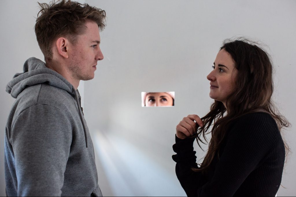 The story is told from two very different perspectives. We first meet Jaz, a budding photographer. He describes his date with Lou with earnest eagerness: it went really well, he hopes to see her again, he took a few photos, he said they had fun…until he receives her text. We separately meet Lou, sat in a bar, with tears in her eyes. The date made her angry, she feels violated; her tender portrayal of a non-consensual encounter is uncomfortably genuine. Between their solo recounts we are led to a set, designed with peep-hole slots, to witness the two characters interact. We watch their date come to a close in Jaz’s bedroom, where this intentional voyeuristic shift allows time for us to observe and to invariably question which side we want to take.