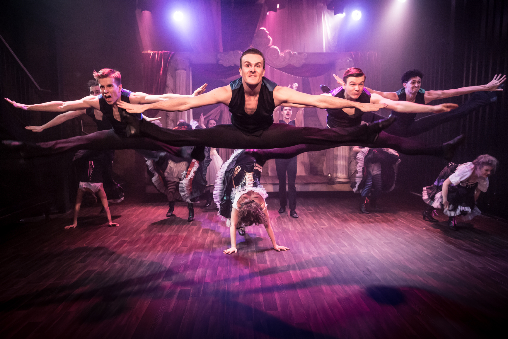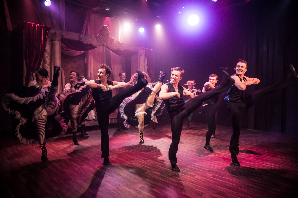 A loud “yeeeee” hurdles through the small theatre as four women, dressed in 1890s-style cancan outfits, high kick across the stage. They are accompanied by four men doing split jumps, leaps and rolls. The music is too loud, and it feels like someone could get kicked in the face at any moment, but the energy is high, the dance moves are amazing and we can’t help but clap along.