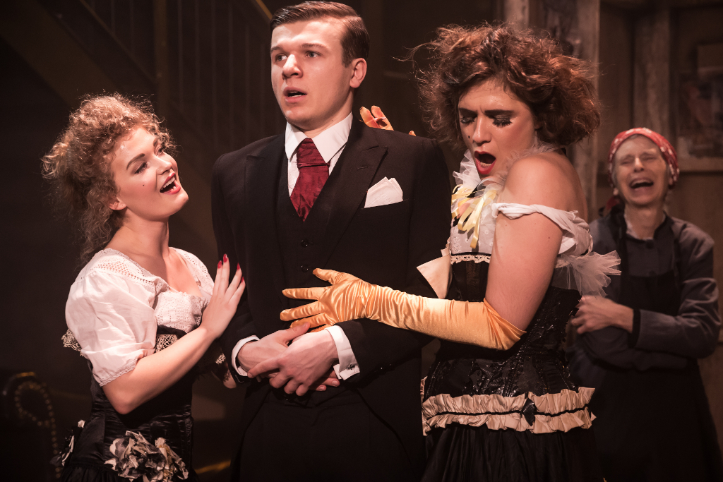 This operetta swaps Trelawny’s British setting for Paris during the “naughty 90s” – the 1890s – and loosely bases the characters on figures from the Bohemian movement around that time, such as Jaques Offenbach, La Goulue, Toulouse as well as the real-life Bontoux banking family. The costumes and versatile moving stage set the scene well and, while the performance area is small, it is easily adapted from a dance hall to a stately home to a deserted fairground.