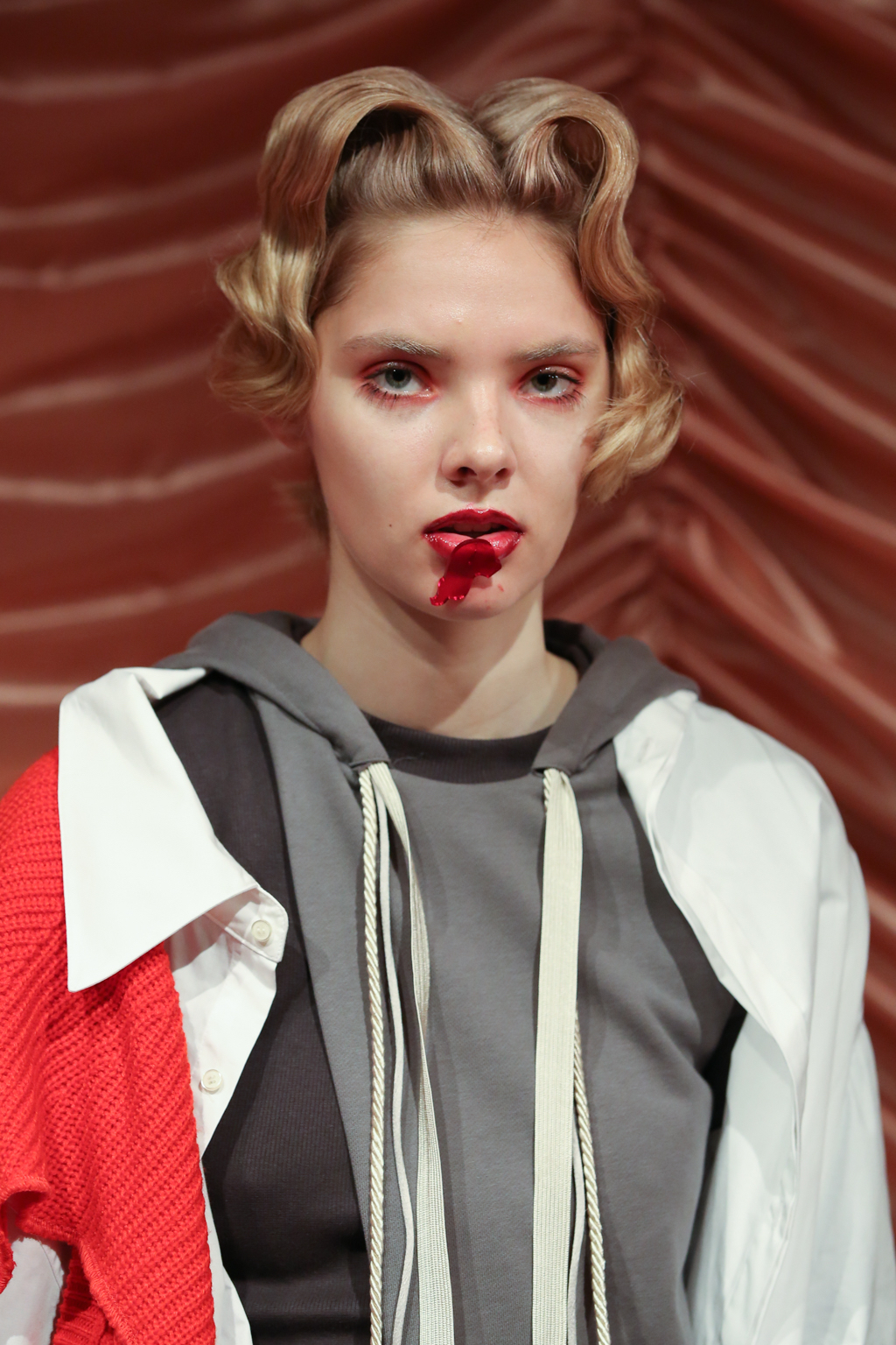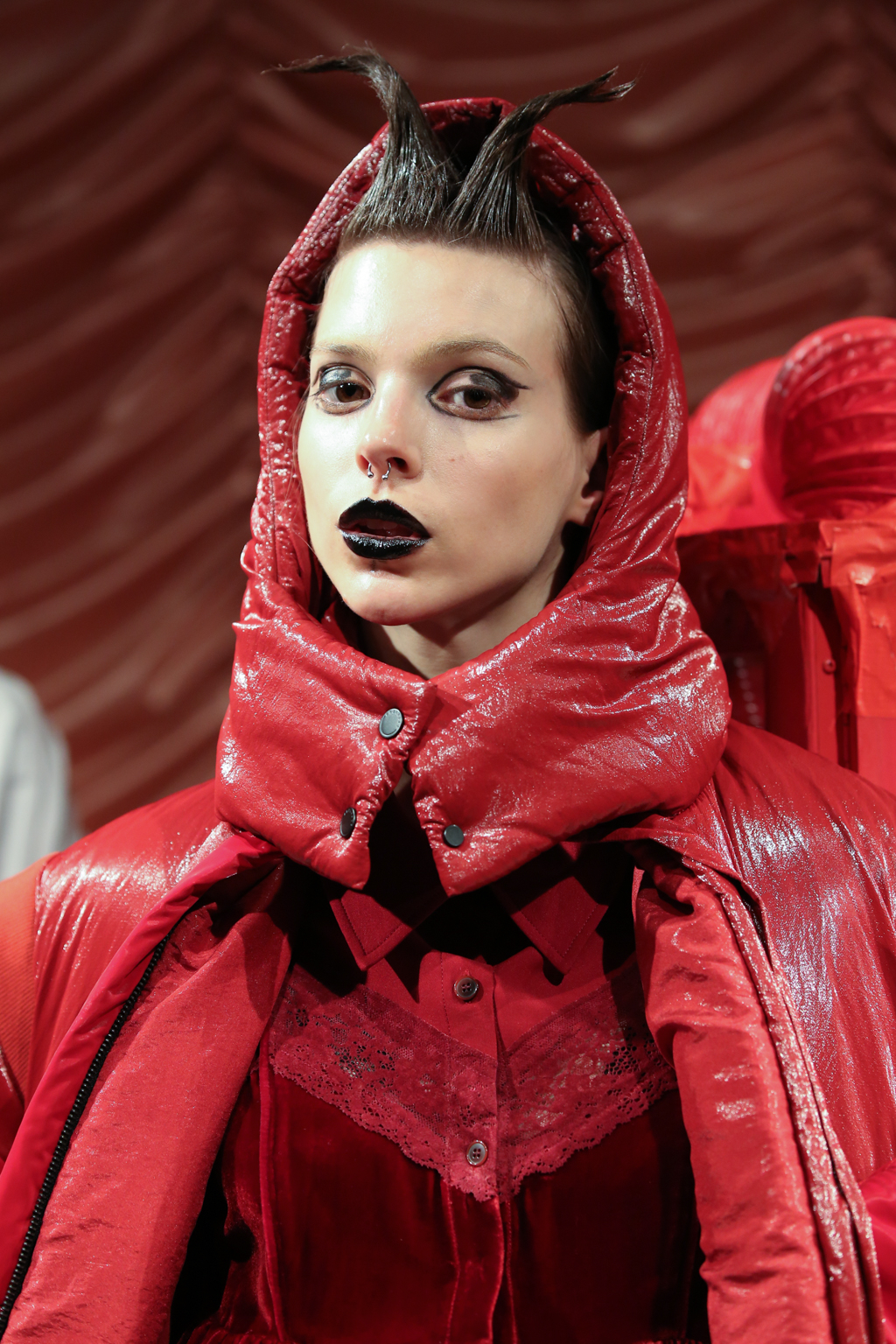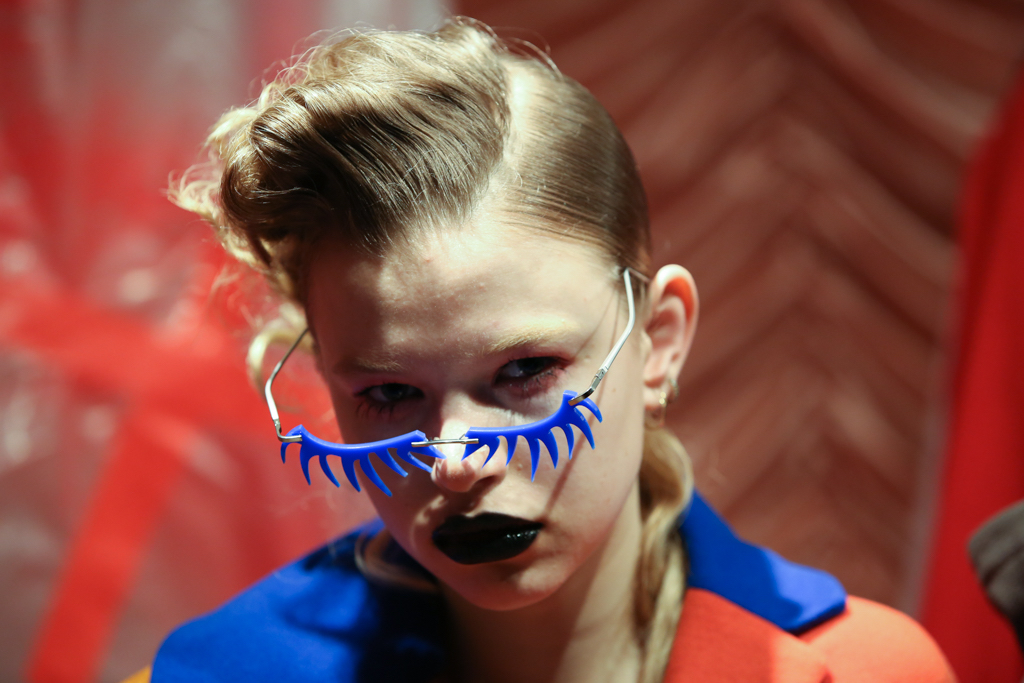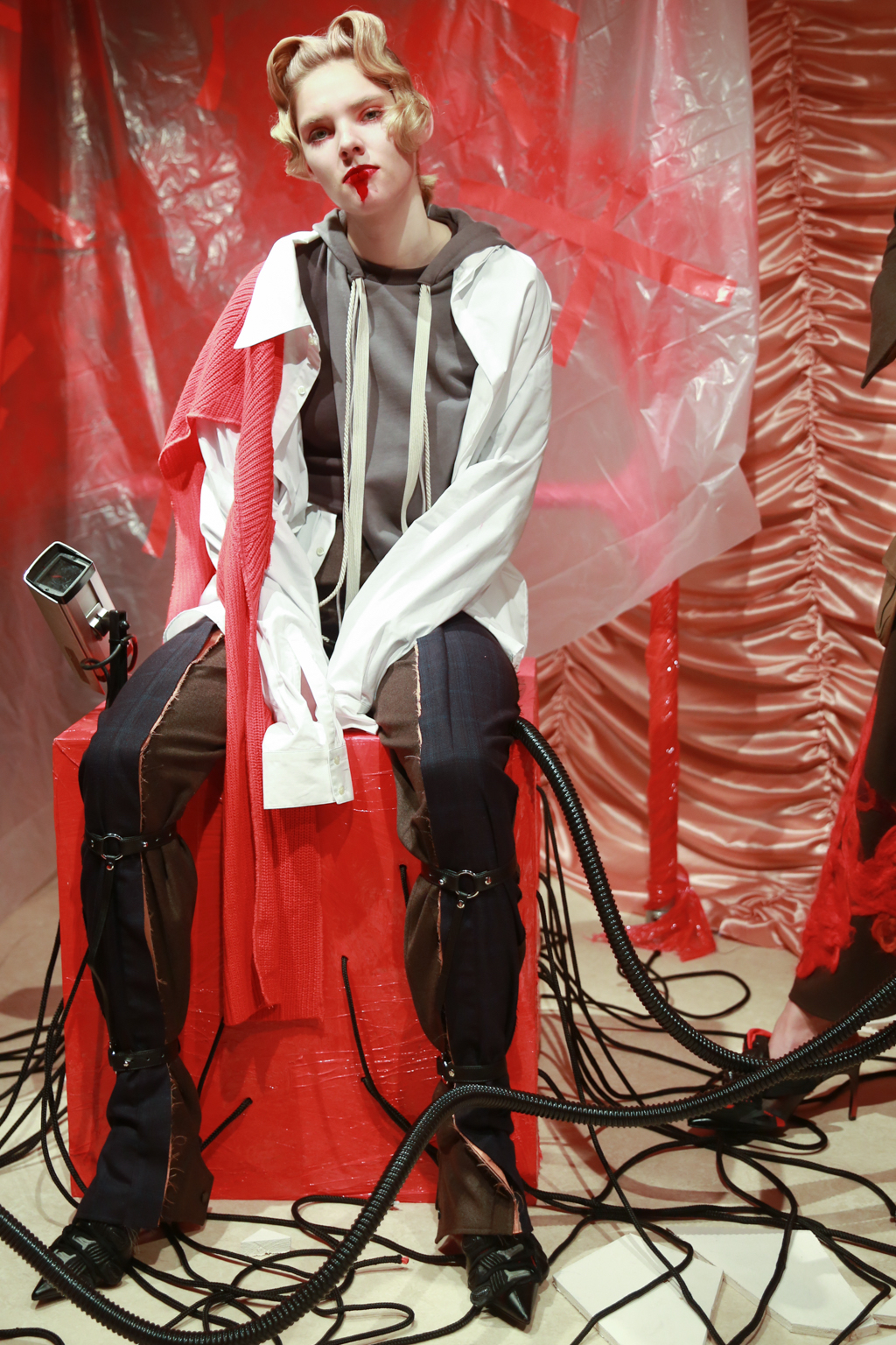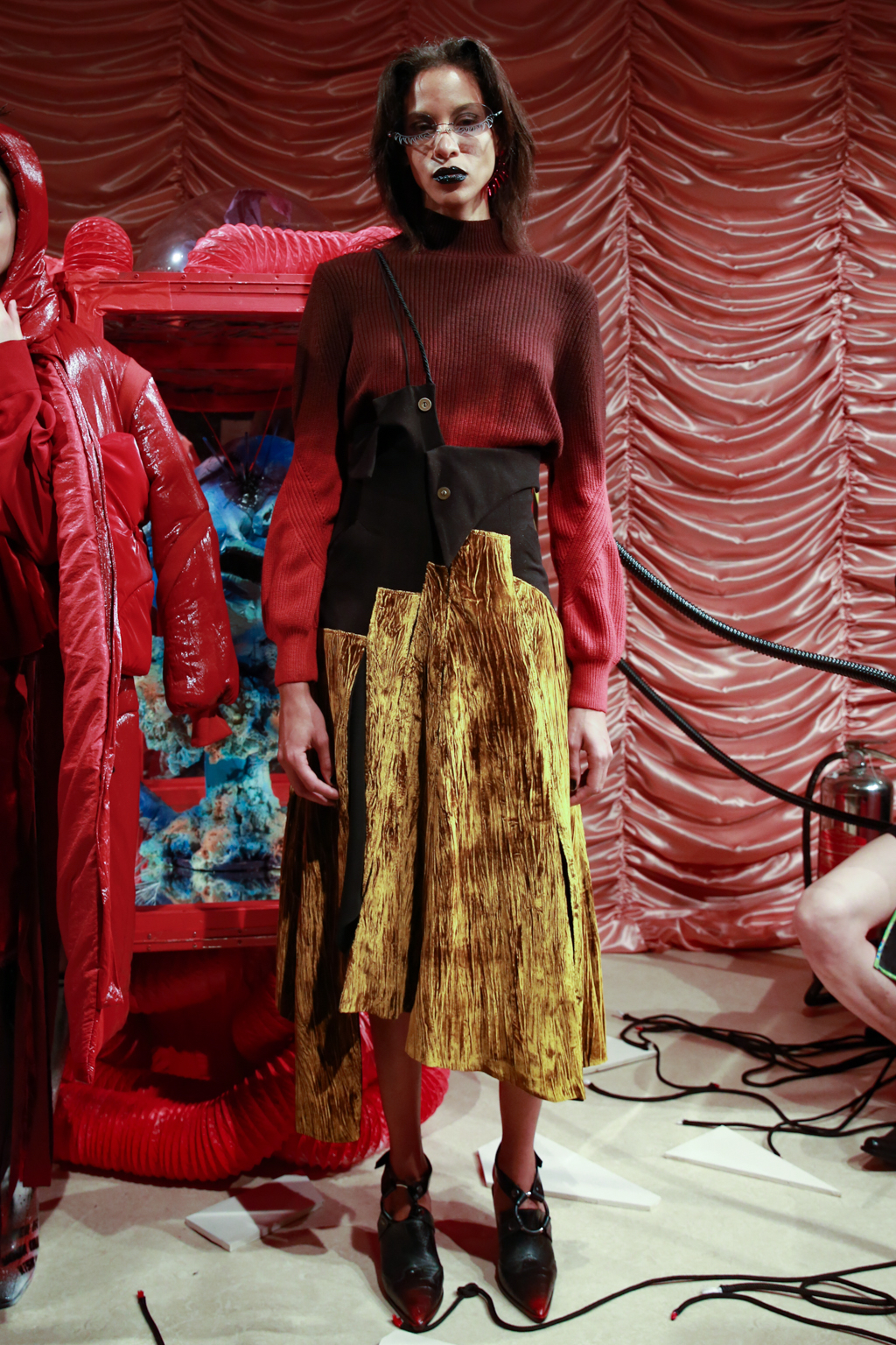 The outfits bring together simple t-shirts with puffer jackets, smooth jersey trousers and combed knitwear. Velvet is paired with metallic details. There is a hint of crochet, but there are also leather laces tied up the calf. One of the jackets sports a sticker patch with the brand’s name, while an uneven maculated skirt is matched with a fading burgundy pullover. Red, as the set for the presentation also emphasises, is the predominant colour, featured in different shades. Glasses – in the shape of eyelashes, drawn-on grey plexiglass or cut out in electric blue – are common accessories.