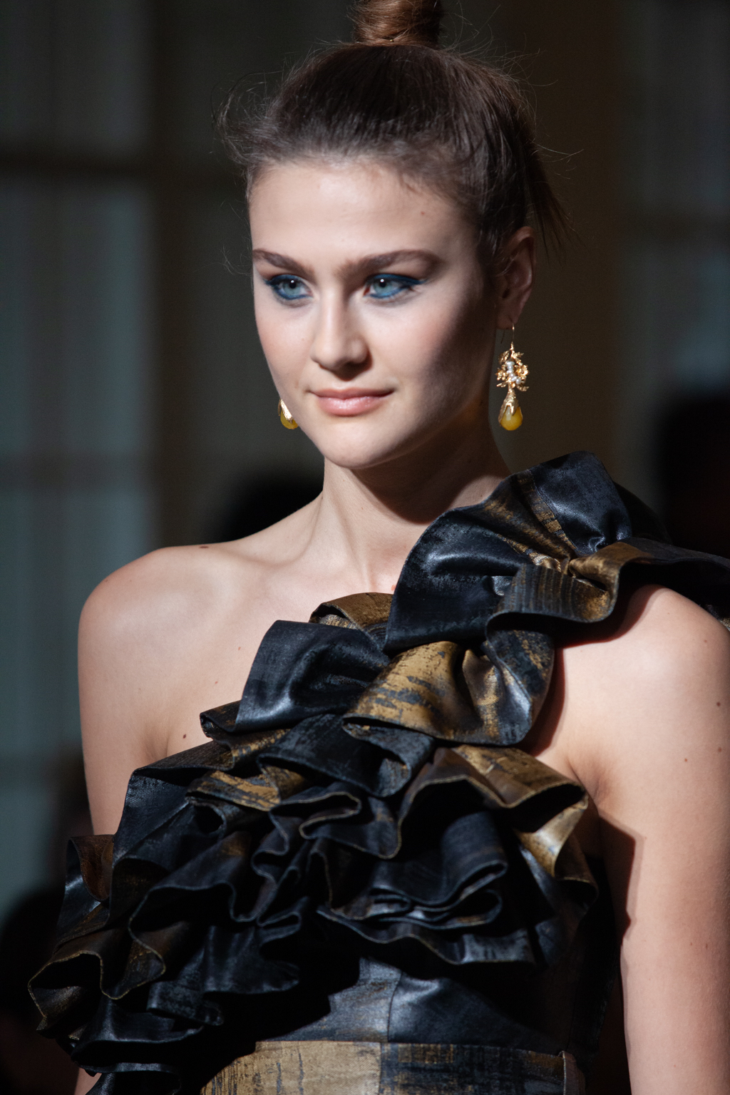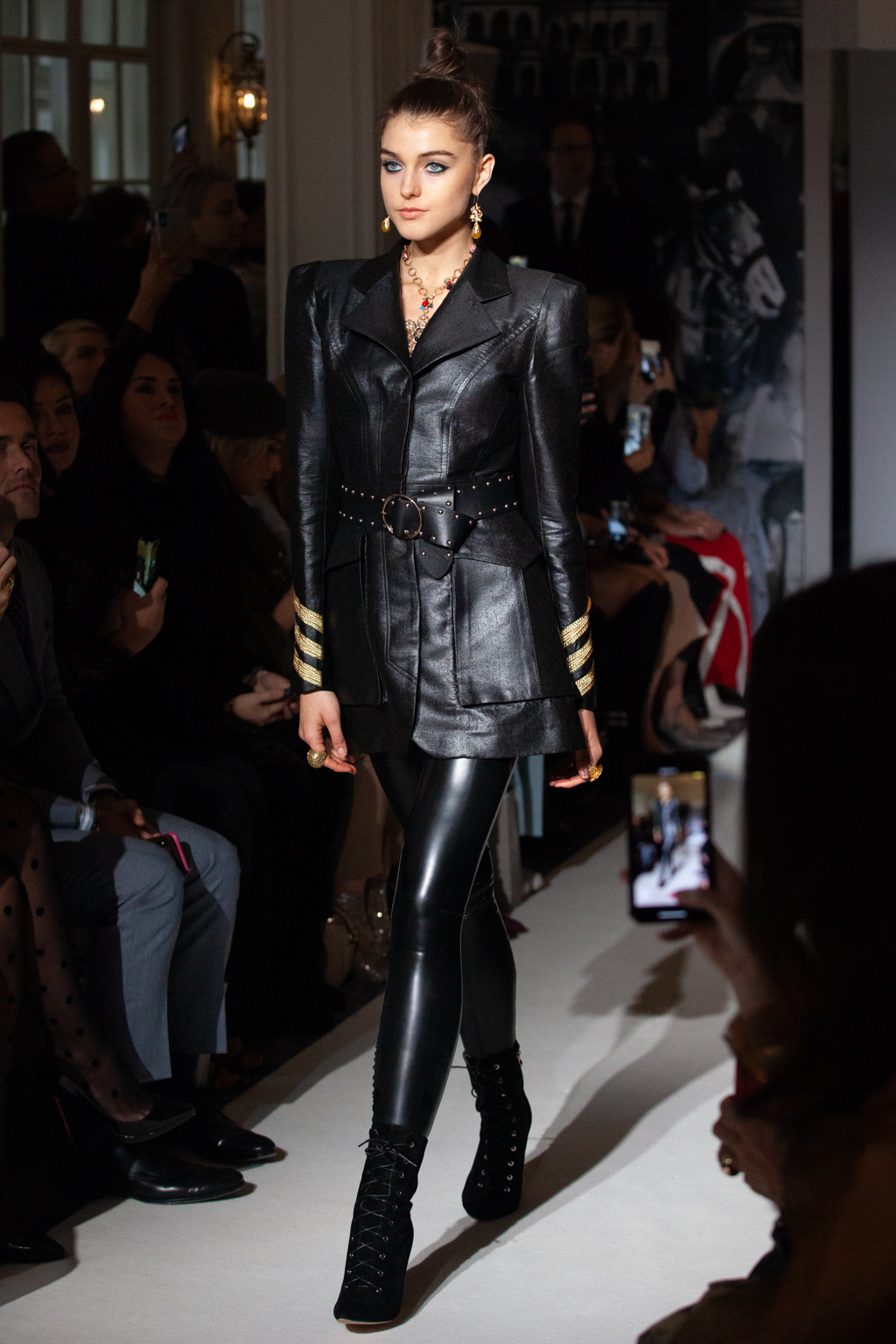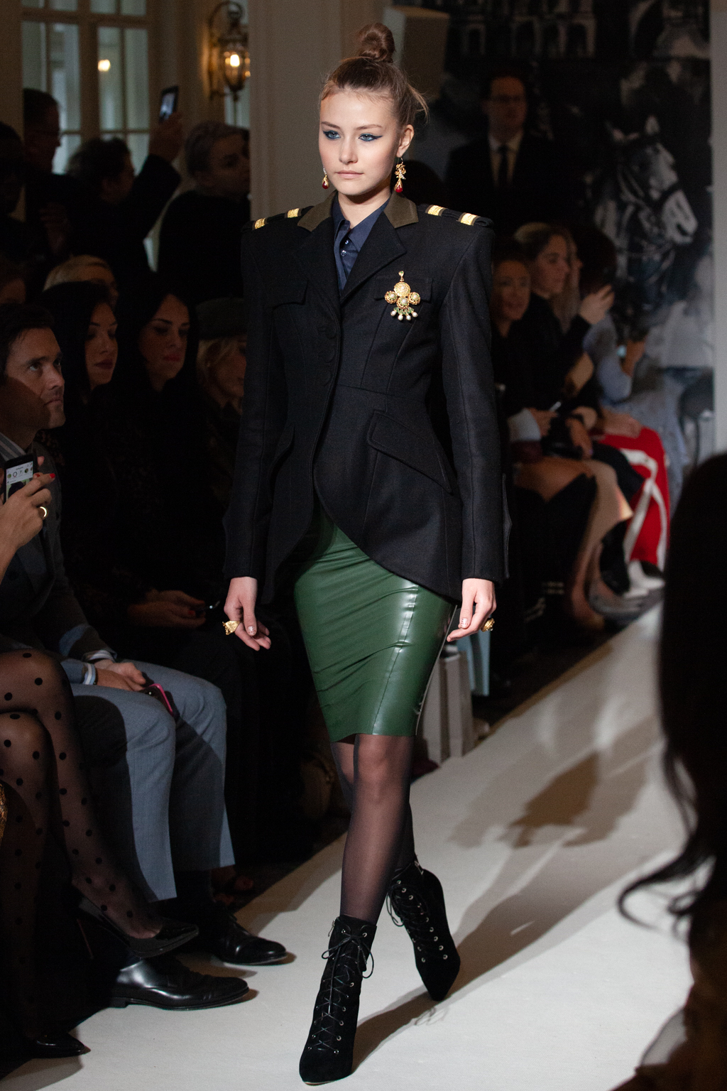 This line-up was awash with billowing gowns, oversized Aran knitwear and sultry leather separates in autumnal shades of claret, black and green, frequently completed with lace-up boots, chunky satchels and belt bags.