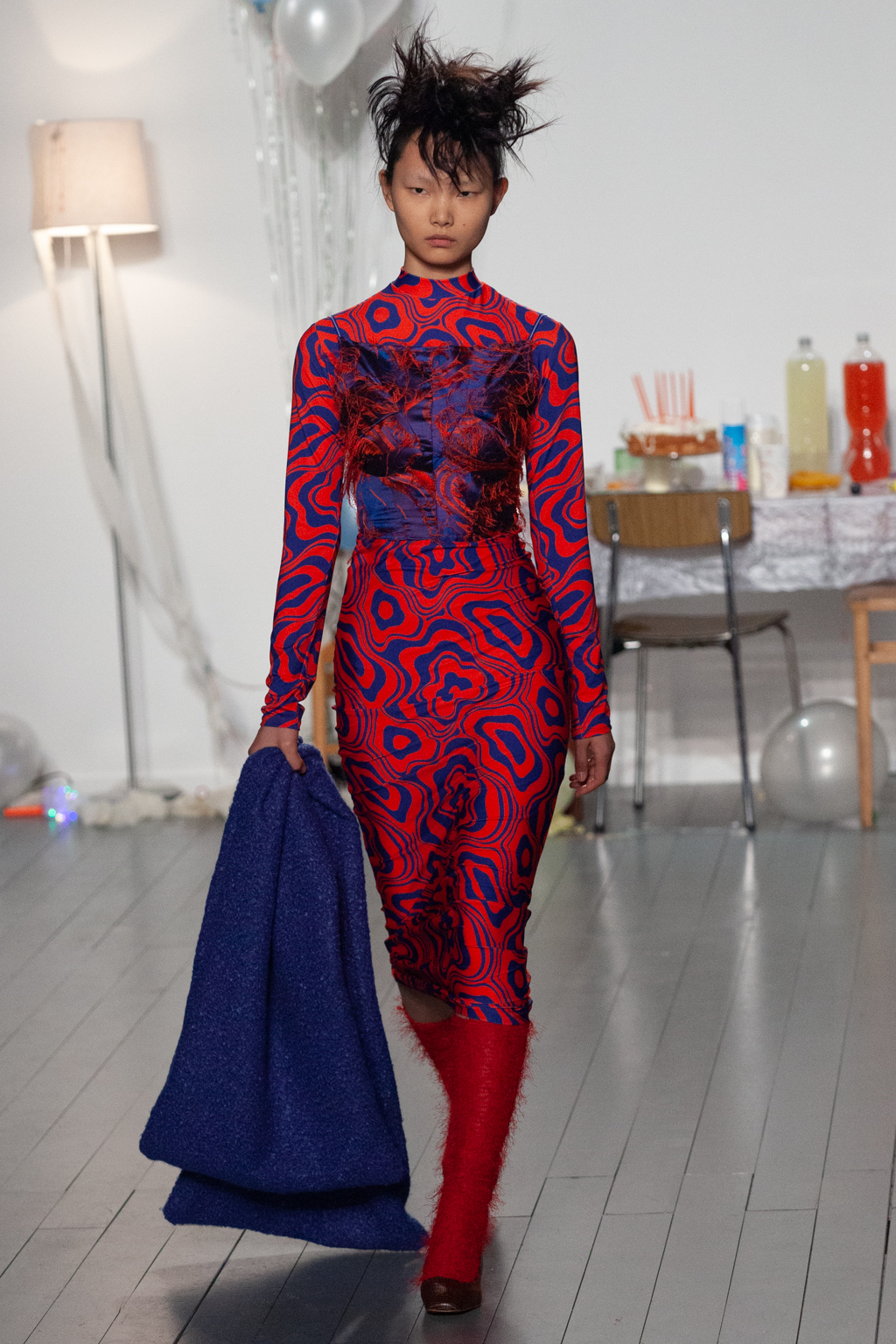 Retro party plate prints took centre stage, alongside varying chequered patterns, frayed silk and laddered knits that enveloped the figure like wrapping paper. Meanwhile, sharp-shouldered suiting, mohair outerwear and vibrant dresses catered for the grown-ups.
