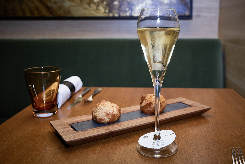 Once inside, you’re ushered into a dining room which oozes elegance while retaining a trendy, modern feel. There is an impressive bar area showing off all 110 bottles, dramatically illuminated to create a showy centrepiece. As we sat down we were greeted with a couple of delicious gougères and a glass of Pierre Moncuit champagne, which made for a very welcome start to the evening.