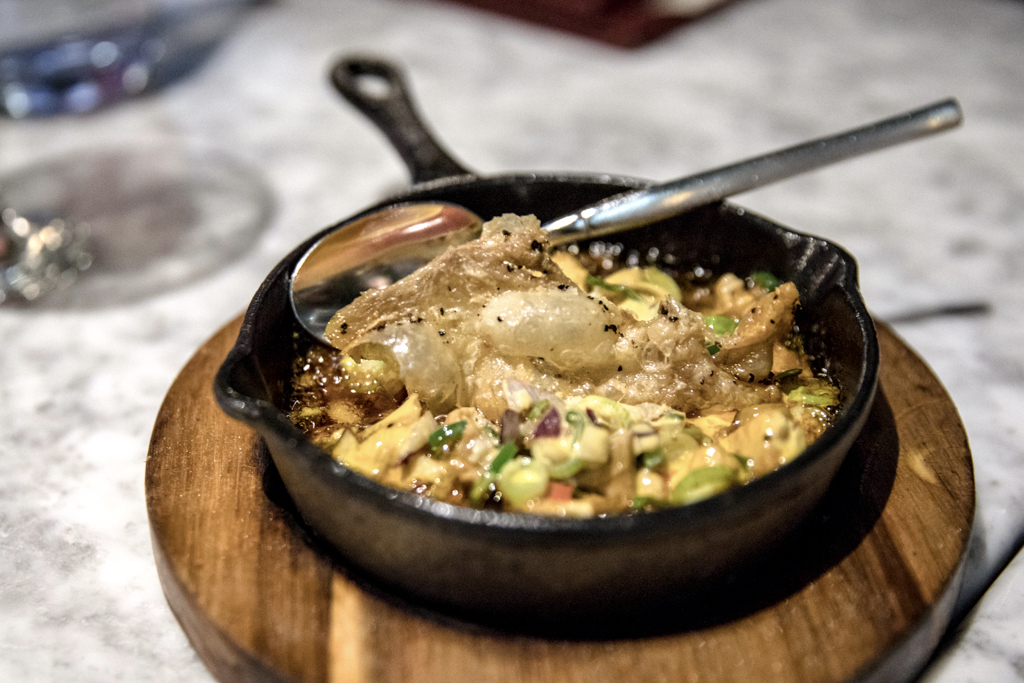 From the platitos – the tasting plates combining traditional Filipino cuisine with British produce – we first try the Sizzling Chicken Inasal Sisig, which arrives truly sizzling on a hot pelt pan. The diced thighs are superbly marinated in annatto, green chilli and garlic, filling the mouth with contrasting though fully enjoyable flavours. An equally delicious fresh option is Kalamansi-Cured Tuna Ceviche, in which the tender fish is cured with lime, ginger and beetroot chips.