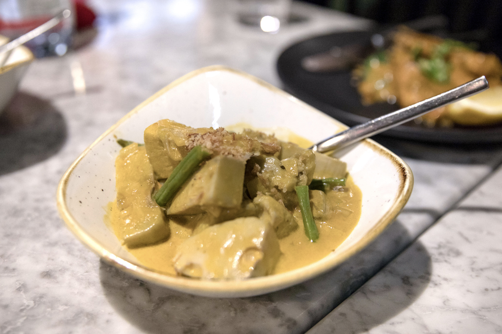 The Young Jackfruit and Coconut Stew that comes next is a real discovery. This fruit, common in South Asian cuisine, is not usually found in the Western world. Stewed in coconut cream and finished with annatto oil, its fleshy texture is exalted in this dish, steering away from monotony with a touch of chilli and ginger.