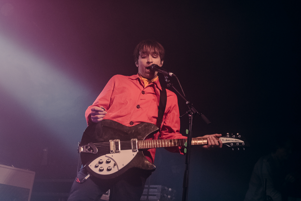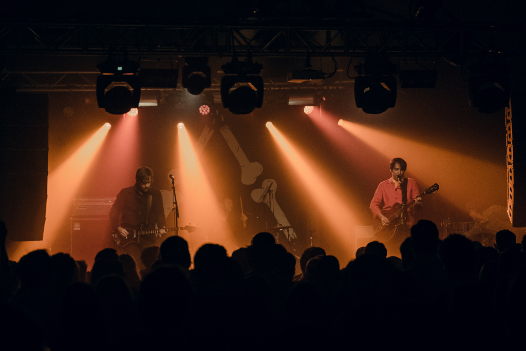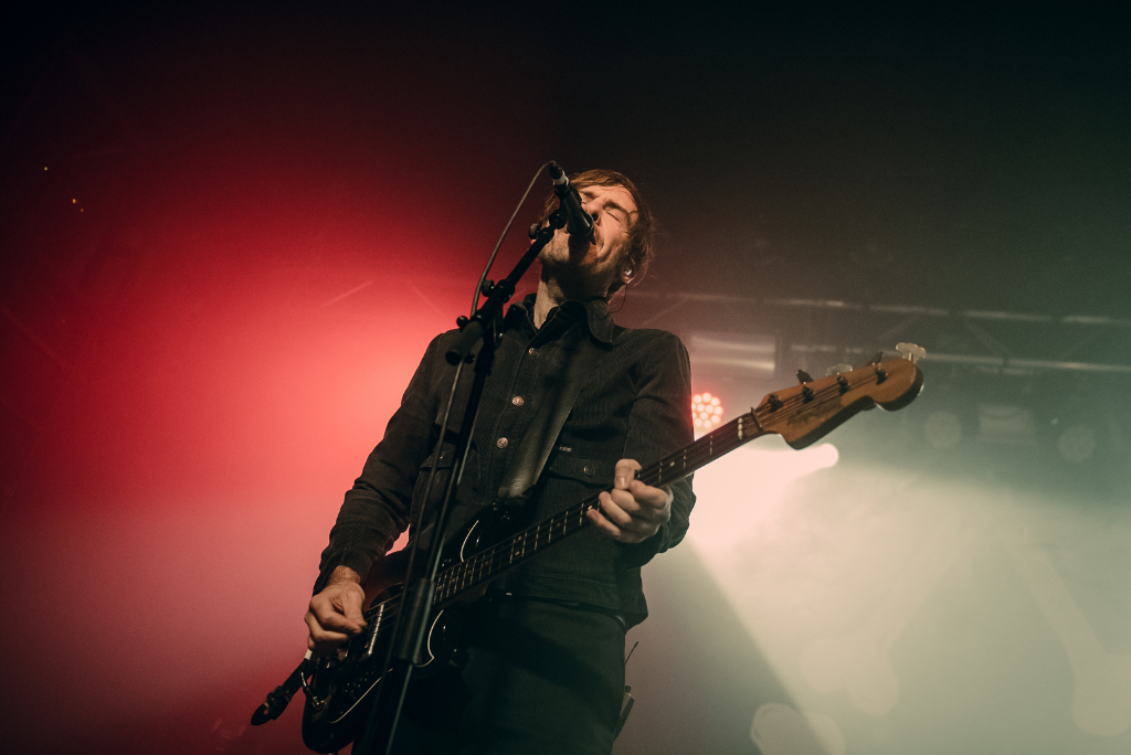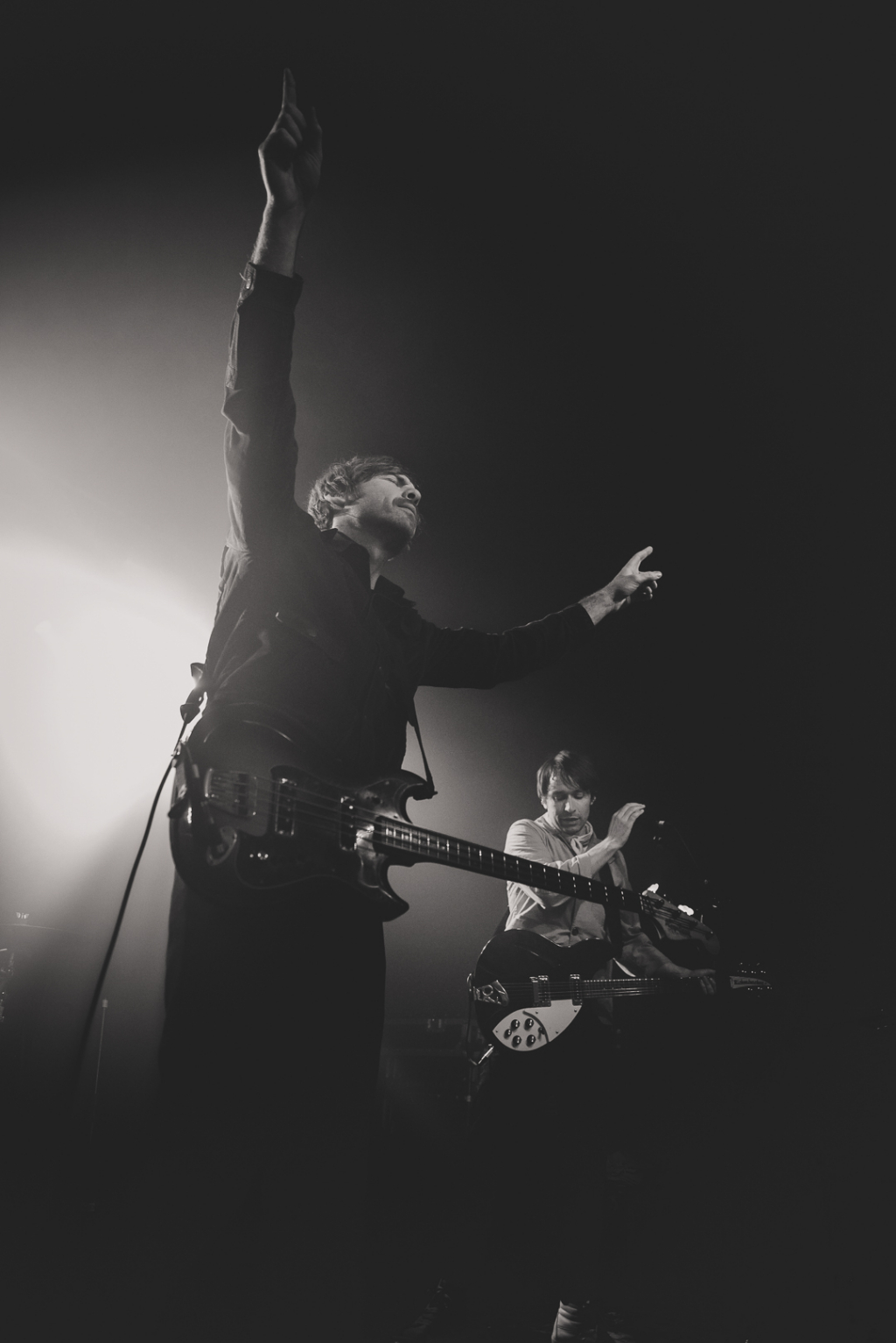 An animated audience grew silent as blue strobe lights dimmed, leaving only the ominous pyramid of bones painted on the large black screen to the back of the stage – the band’s iconographic reminder that, as their 2018 album title predicts, the world is headed towards Darker Days. A few moments later brooding synths pierced the silence, and the three men burst onto the stage for a very raw refashioning of Let’s Call It Off, their 2009 collaboration with Drake. Their second number Far Away, By My Side whipped up an even larger frenzy of epileptic drums and guitar, until during Eyes – their fifth – Morén, running up and down the stage to suddenly stop and spin in circles, launched into a kaleidoscopic solo matched only by his psychedelic red and yellow attire. The song’s offensively inoffensive lyrics were happily lost in the whirlwind.