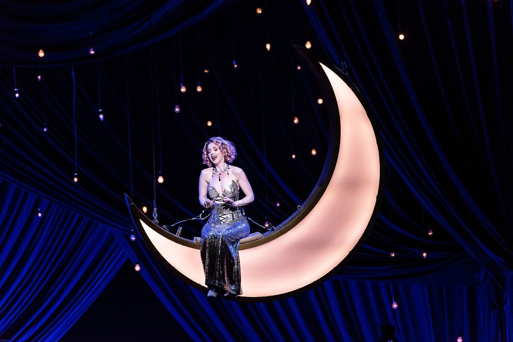 April De Angelis’s translation and Max Webster’s direction reimagines Lehár’s masterpiece as flashy and fantastic with a witty Hanna whose love for Danilo (Nathan Gunn) in the will-they-will-they-not style of Shakespeare’s Much Ado About Nothing inspires a dreamy Vilja while she is perched on a crescent moon above the stage. The melodic Merry Widow Waltz and Chez Maxim offer a fun chorus that is animated by Kristiina Poska’s conducting and with English lyrics by Richard Thomas.