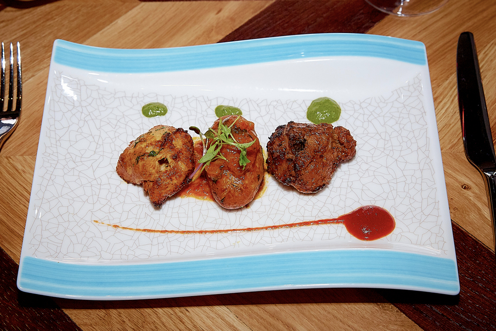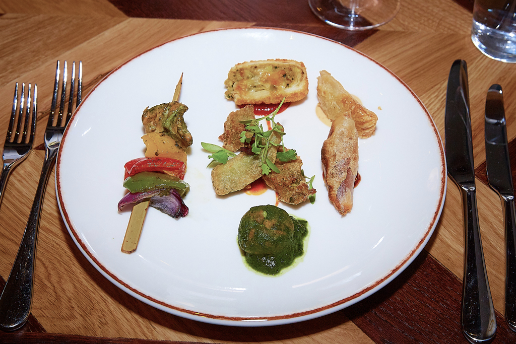 We began our evening with a first course featuring an interesting mixture, predominantly vegetable-based. The broccoli, mushroom and chilli cheese roll had a tender consistency against the thicker pastry. Finely fried, the prawn spring roll had a tasty pulpy filling, whereas the Partridge Kavaab found its perfect finishing on the light garlic Mayonnaise. The crunchiest piece was the Beetroot and Coconut Samosa, which was rather less sweet than anticipated.