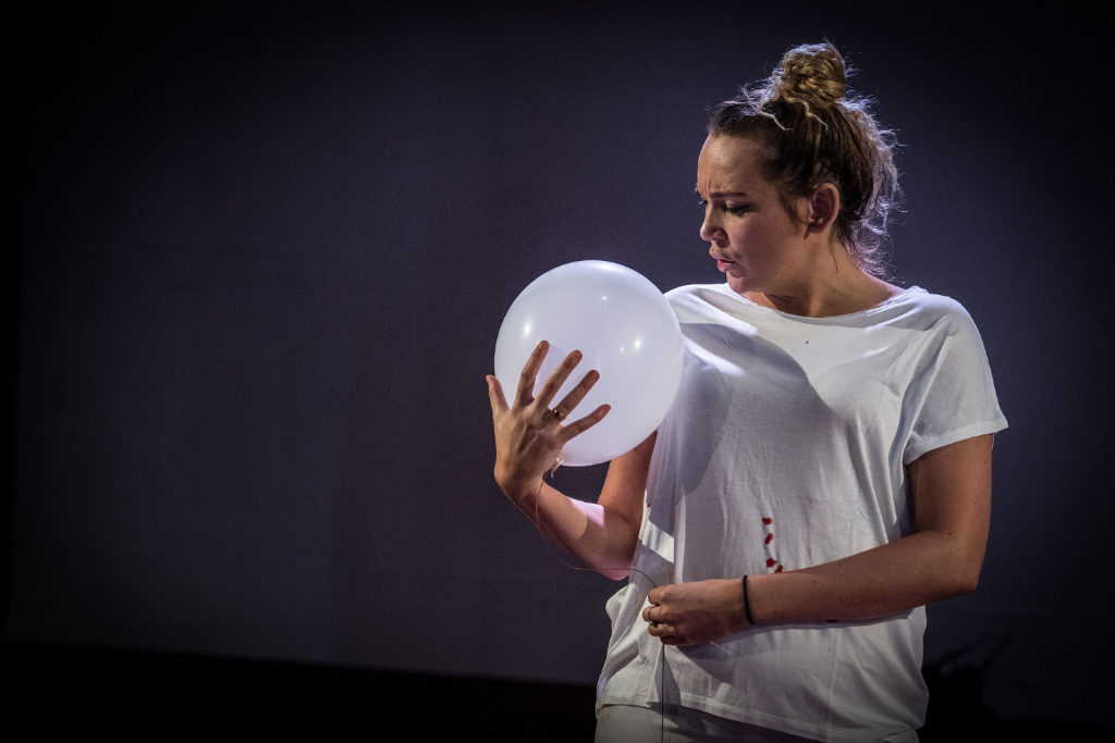 Box Clever is the tale of Marnie, a young single mother who flees to a women’s refuge after her boyfriend Liam breaks her nose. Redd Lily Roche appears on stage in white jeans and a white t-shirt stained with blood. Her husky, resonant voice fills the space and her conviction resonates with the audience. Each character she plays is defined by their voice and body language: Fifi, the ineffectual-bordering-on-malicious key worker; Marnie’s Mum; the evil Liam; Autumn, Marnie’s four-year-old daughter, represented by a balloon; all feel completely believable.