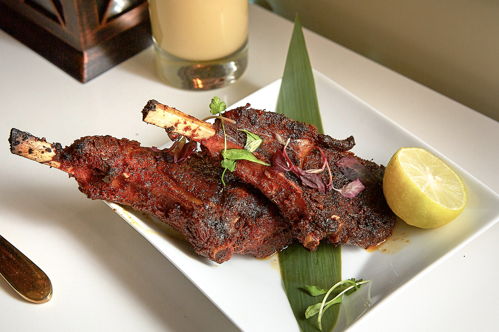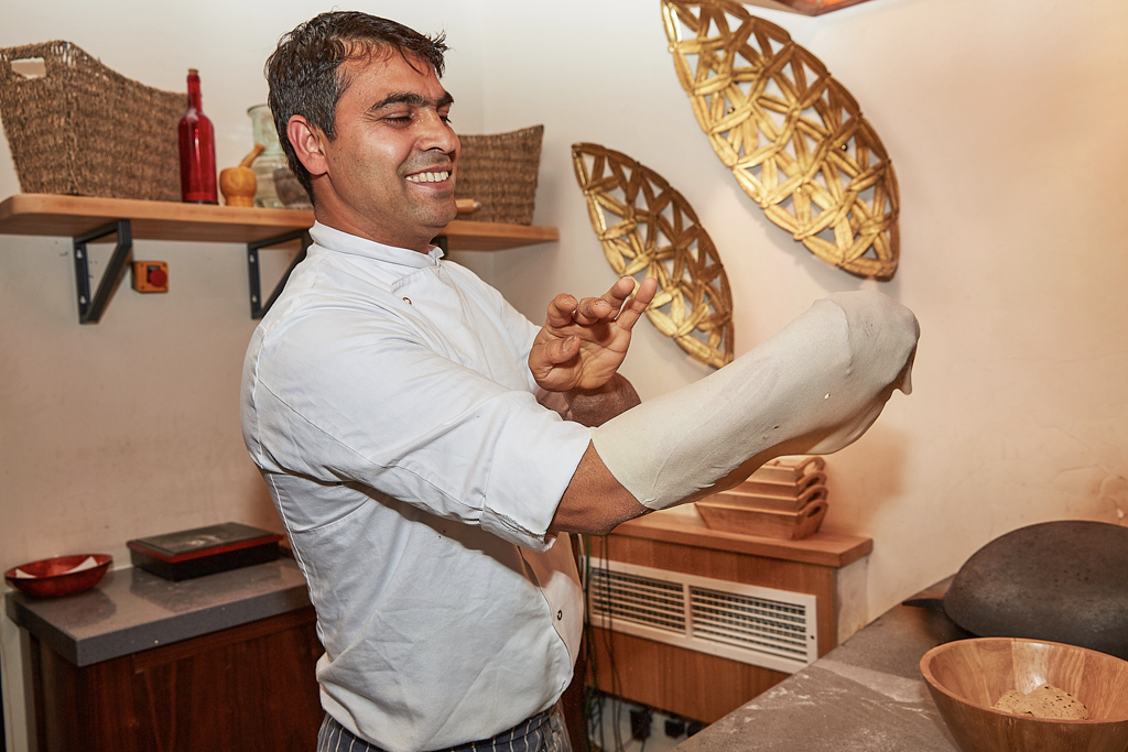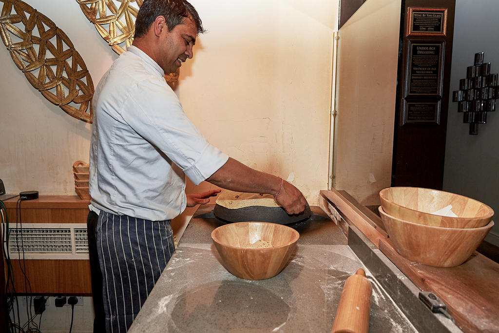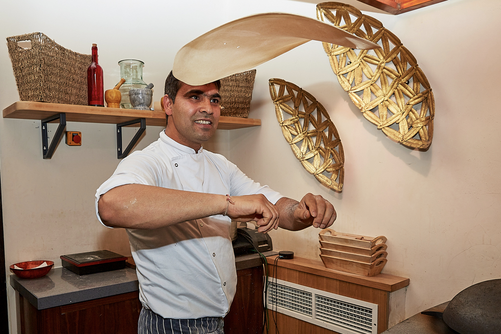 The interiors are sleek, decorated with artefacts, glassware and china sourced from Indian markets and antique shops. There is also plenty of copperware throughout the restaurant, most notably in the form of an extractor hood located above a member of staff who artfully spins balls of dough into hankies, from which this restaurant takes its name. These are a classic Indian roti, which is hand-spun until ultra-thin and then cooked on a burning hot tawa and folded into the shape of a hankie.