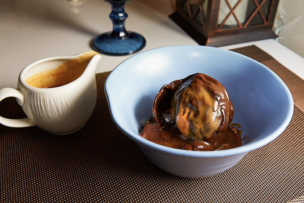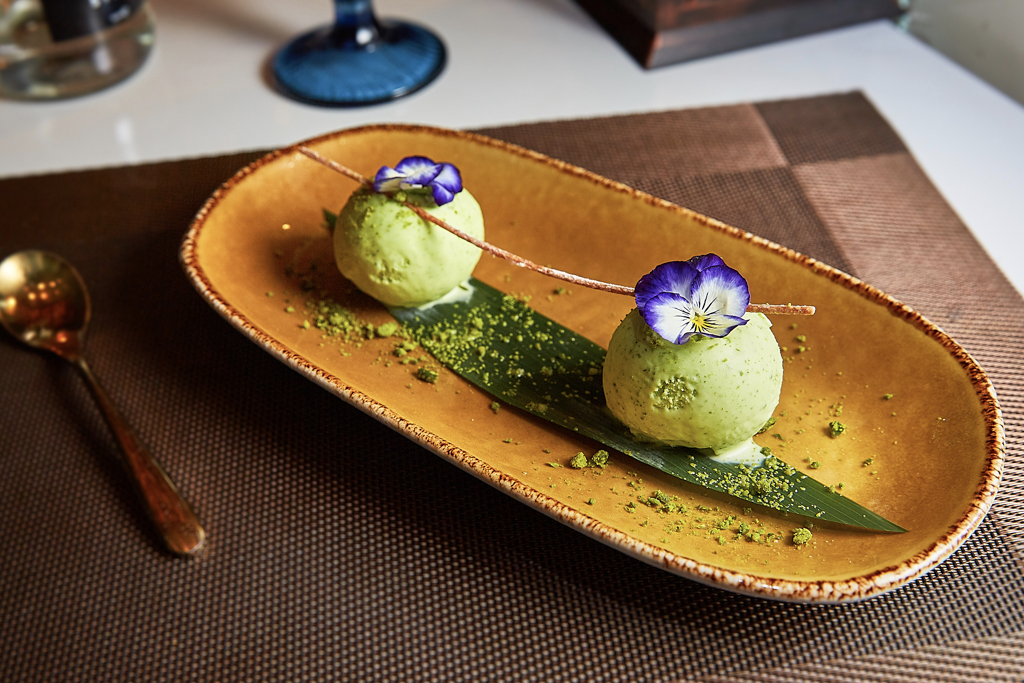 We have to finish on a sweet note, opting for the Chocolate Gola. This dish is all about the theatre, molten caramel melting through a hard shell of tempered chocolate to reveal tutti frutti flavoured ice cream. The chocolate dome sits atop a bed of sweet treasures, with morsels of walnut brownie and fresh nuts adding texture to the dish and balancing the sweetness, and the contrast between the cold ice cream and warm caramel adding a welcome note. We also try the homemade Pistachio Kulfi, which is refreshing but is overall too milky in flavour and missing that strong pistachio flavour that we know and love.