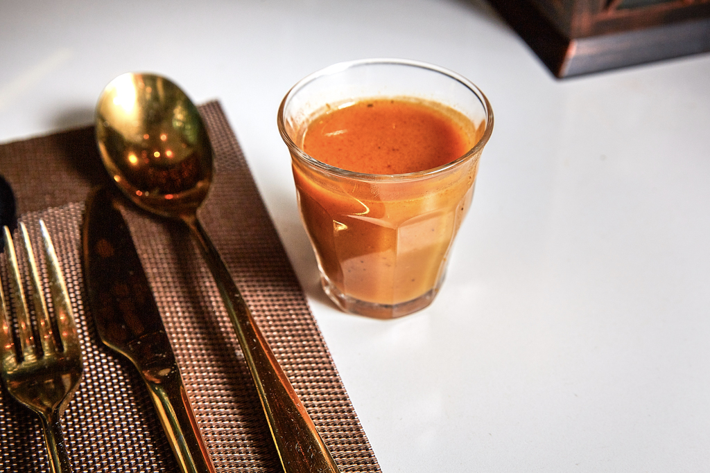 Soon after, we’re served with a steaming shot of tomato soup, which is strong and spicy, leaving a hum of warmth at the back of the throat from notes of cinnamon and cardamom.