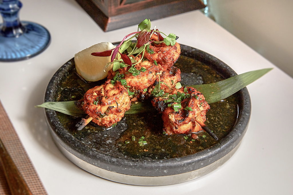 The concept being the sharing of aromatic small plates, our waiter recommends ordering several to try. We begin with Bhindi Bhel – a crispy okra dish served up with rice puffs, sweet chutney, onions and fresh coriander. The first mouthful takes us by surprise, with the starter almost feeling like the breakfast option, reminiscent of granola in its contents of nuts, seeds and fruit. However, it quickly grows on us, and the texture of the dish, along with the punch from pomegranate seeds, has us going back for more.