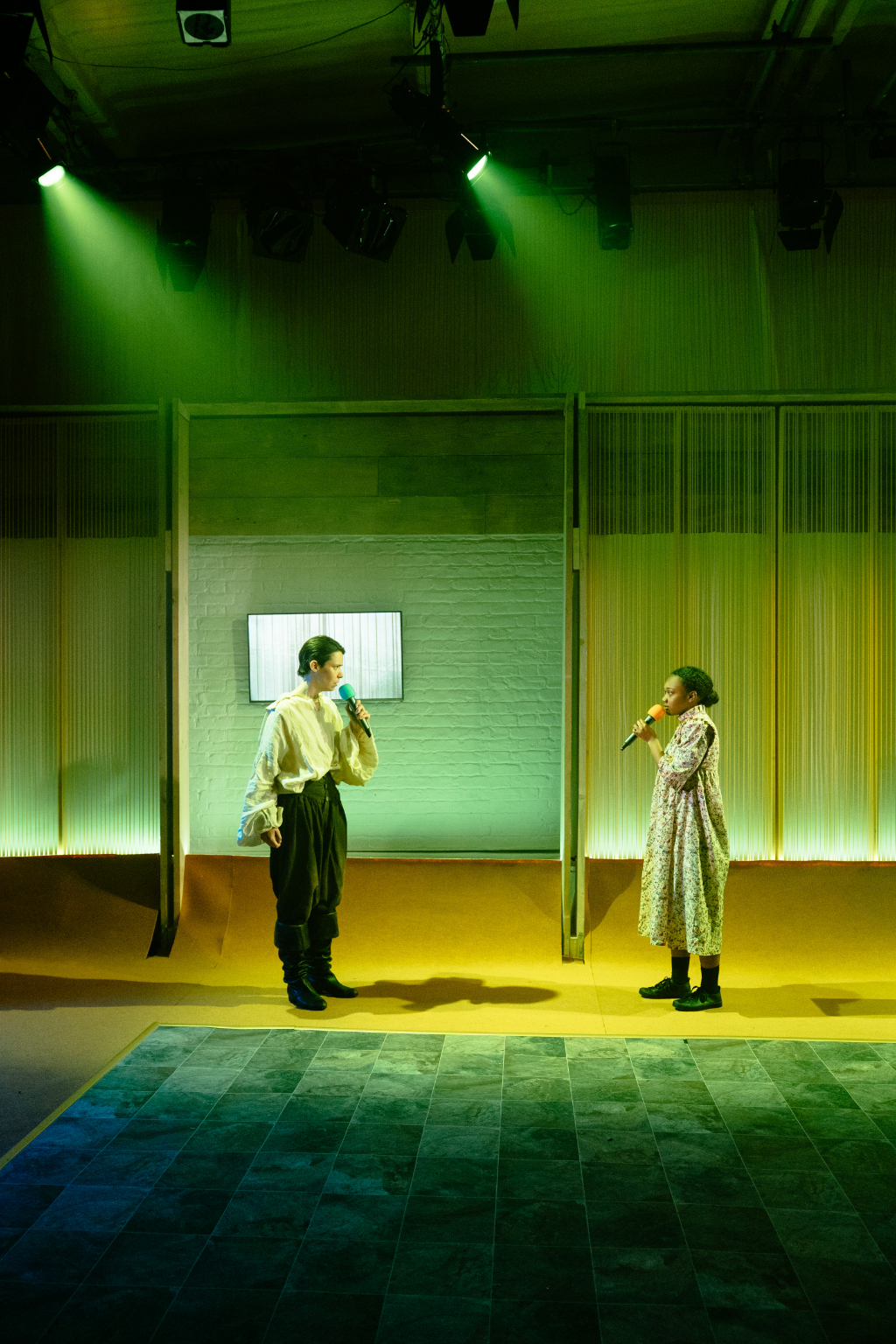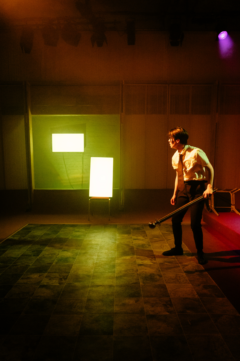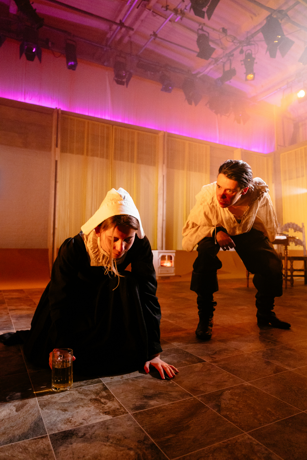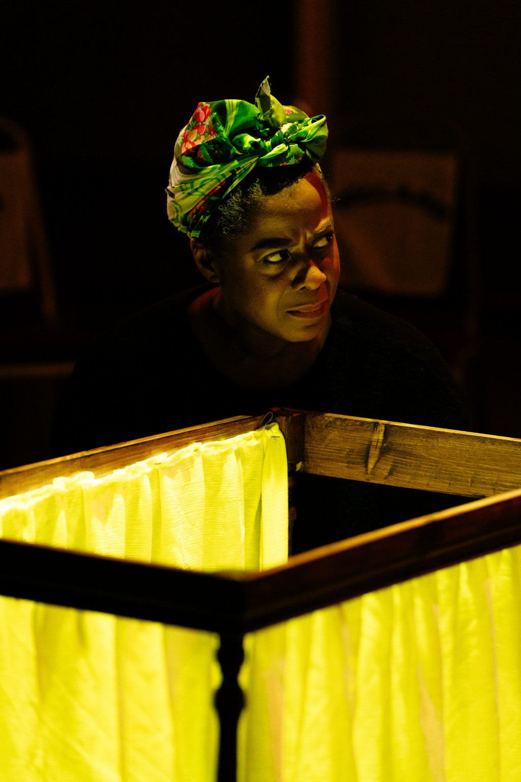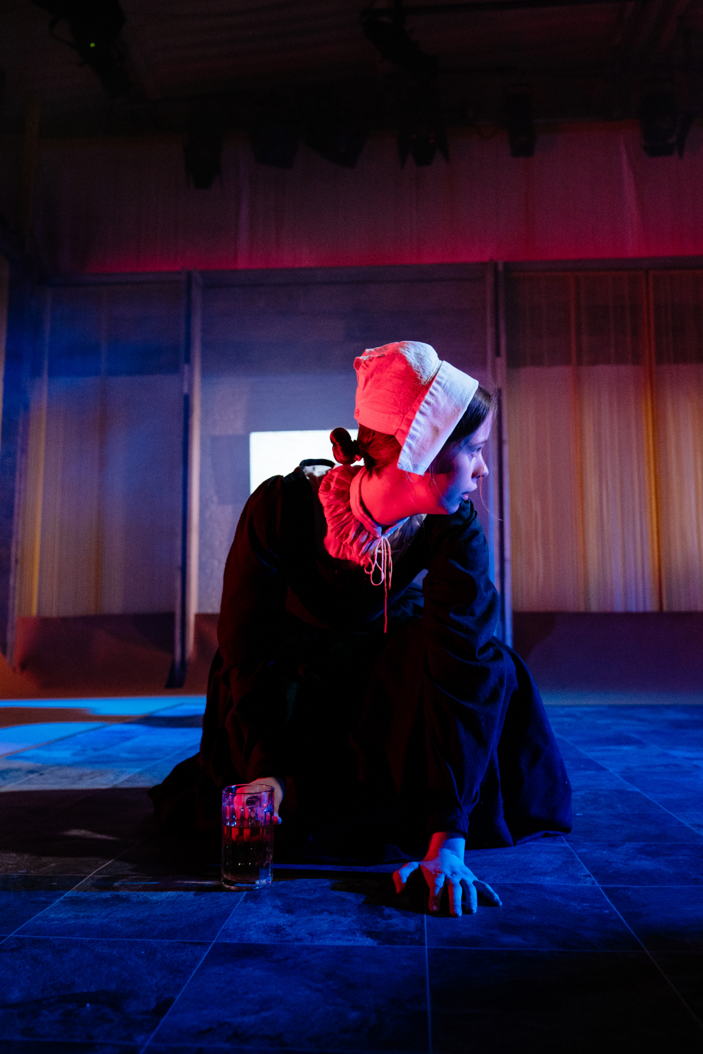 Apart from the script, acting is this production’s solitary strength – and, despite this review’s rating, the show is easily worth seeing for this alone. The rest of the cast holds up to the Proctors’ high calibre; however, inexplicable set and direction choices undermine them. As the judge, Jacob James Beswick – notable for the severity of his Malkovich-like intonation – sits atop three stacked chairs, feet dangling like a child’s in a high chair. What place is this for a judge? Yellow and pink lighting on purple carpets evokes a children’s “fun zone”, while a 50-inch TV lazily blurts details that with some inspiration could be artfully conveyed. But perhaps most deplorably, smoke is used in excess – to the point it becomes physically hard to swallow. Note to production: The Yard is small; please don’t suffocate your audience and actors. Think about anyone with respiratory problems, or anyone wearing contacts. And maybe put a warning on your TV?