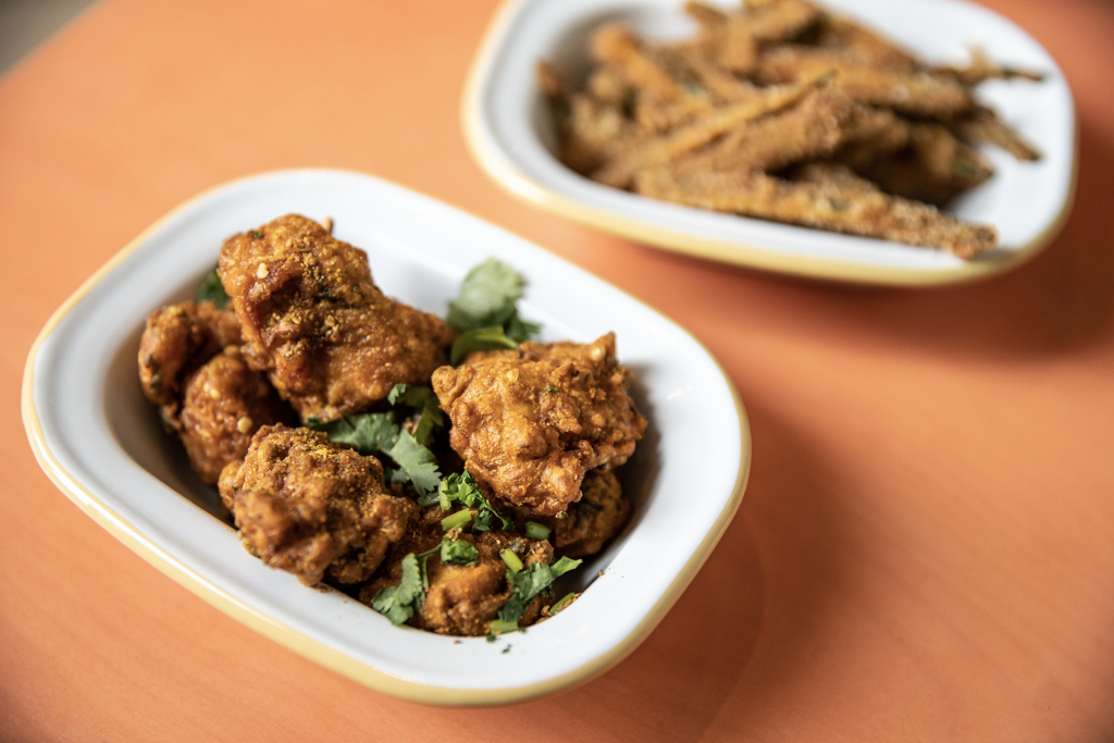 Our lunch begins with a selection of “Bites” to share. The popular Kurkuri Bhindi skinny okra fries coated with spicy, gluten-free breadcrumbs are surprisingly non-greasy and crisp to the bite. Served with sweet Shola house chutney, they offer a healthier choice than the appetising Masala Fries with homemade chaat masala that we also get to sample. Endless retro enamel colour-rimmed dishes appear on the table and as we nibble away on bite-sized Chicken Pakora in mild Shola seasoning we note that their crispy exterior then yields to a surprisingly tender, juicy meat.