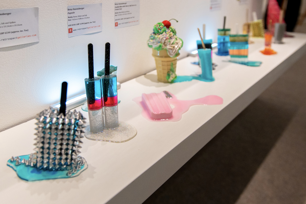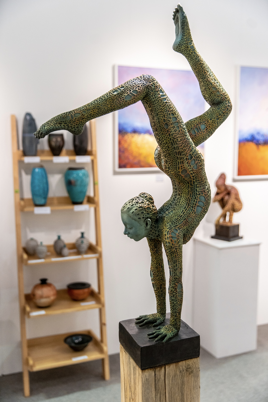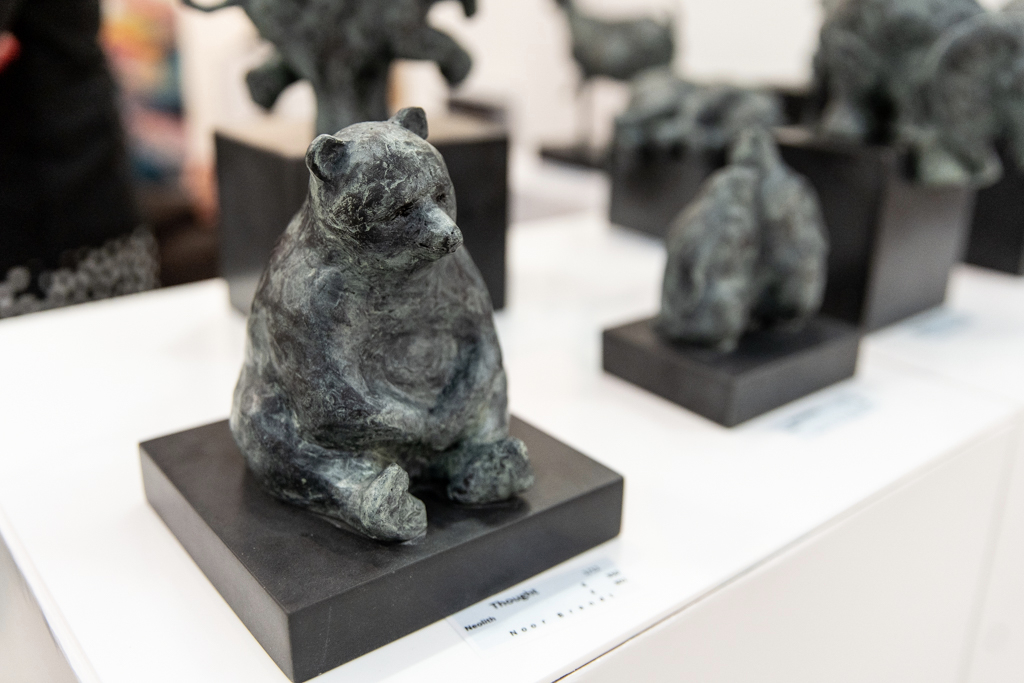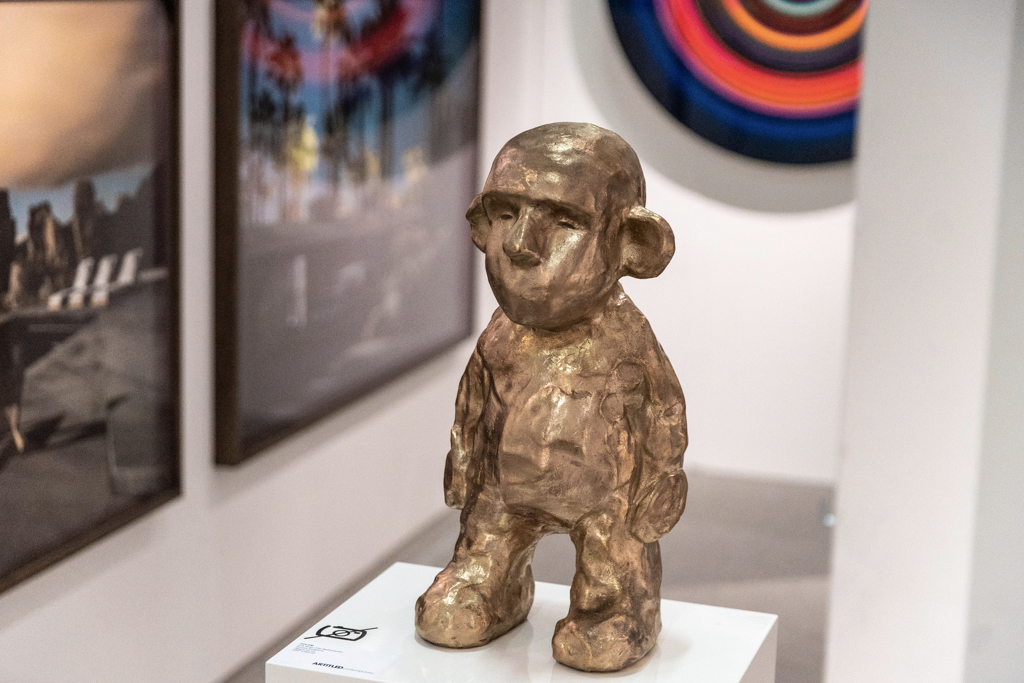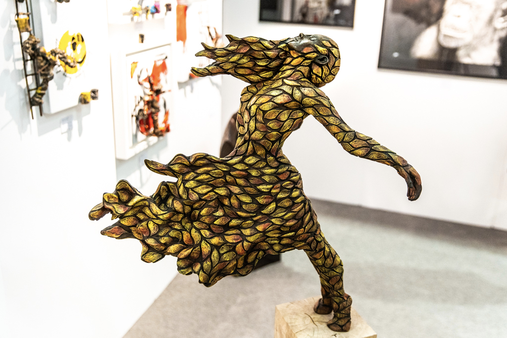 Statues inspired by the animal world abound. Smooth lines are a must, whether applied to ceramic dogs as proposed by ArtZandra, or to the plump penguins by Noor Brandt. Damilola Odusote processes his subjects and the frames into which they are inserted so as to render visual depth between 3D and ink prints. Pop culture and kitsch literally melt together in the resin ice creams by Betsy Enzensberger, while the feminine figures – such as Releasing by Jonathan Hateley – are tumbling though still very graceful.