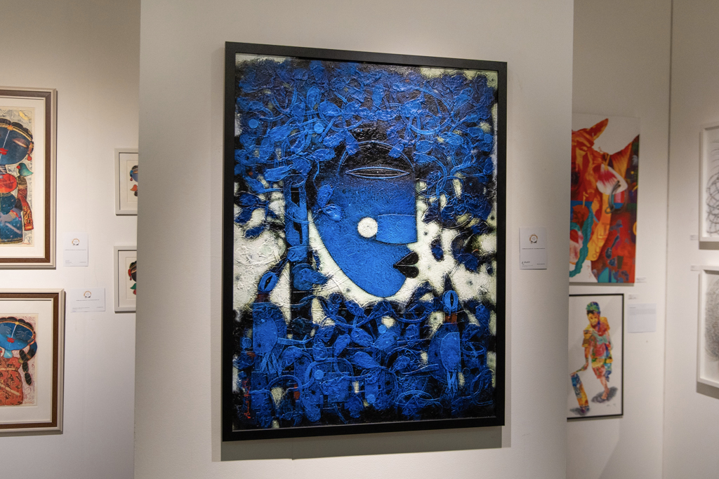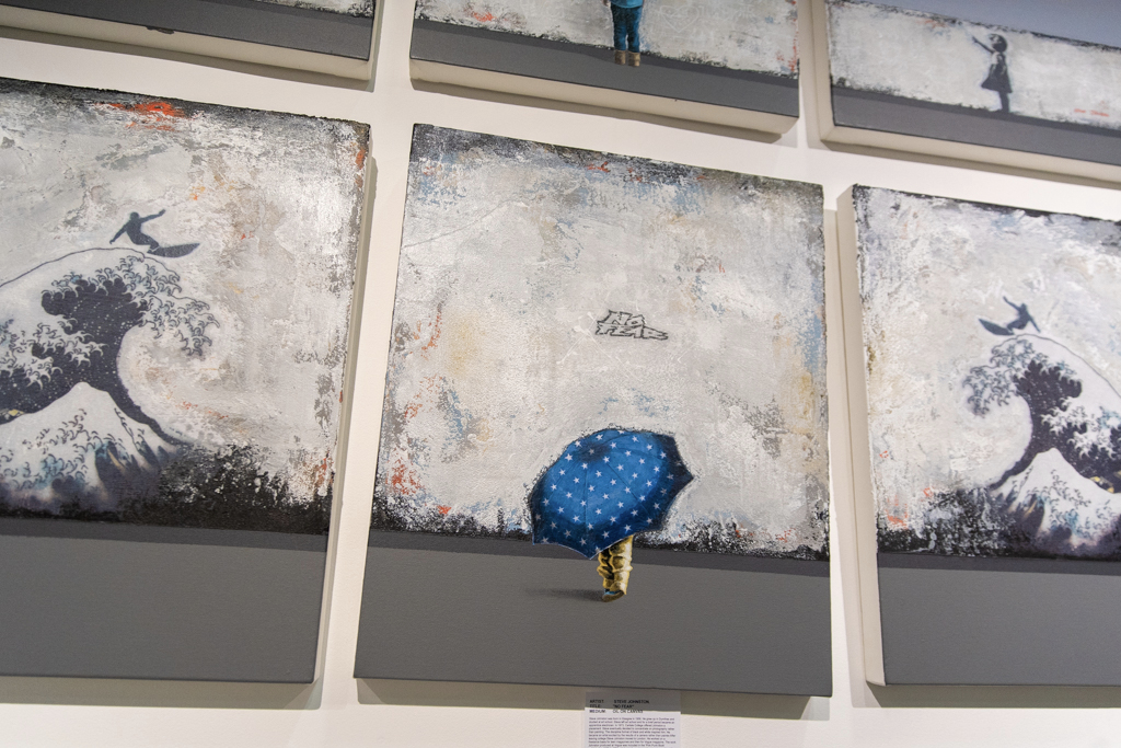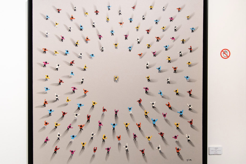Embossed elements and optic effects are some of the most common patterns through the corridors. J J Marino renders indistinct figures materially present, crowding his people with thick layers of paint. Jeon Nak completely captures the viewer’s eyes through three-dimensional depictions with swirling vortexes – blue (as in Axis-F5), yellow and few of mixed nuances – that emerge from black undefined spaces.