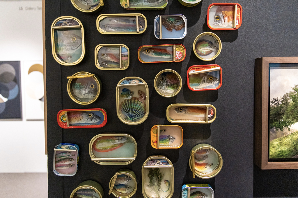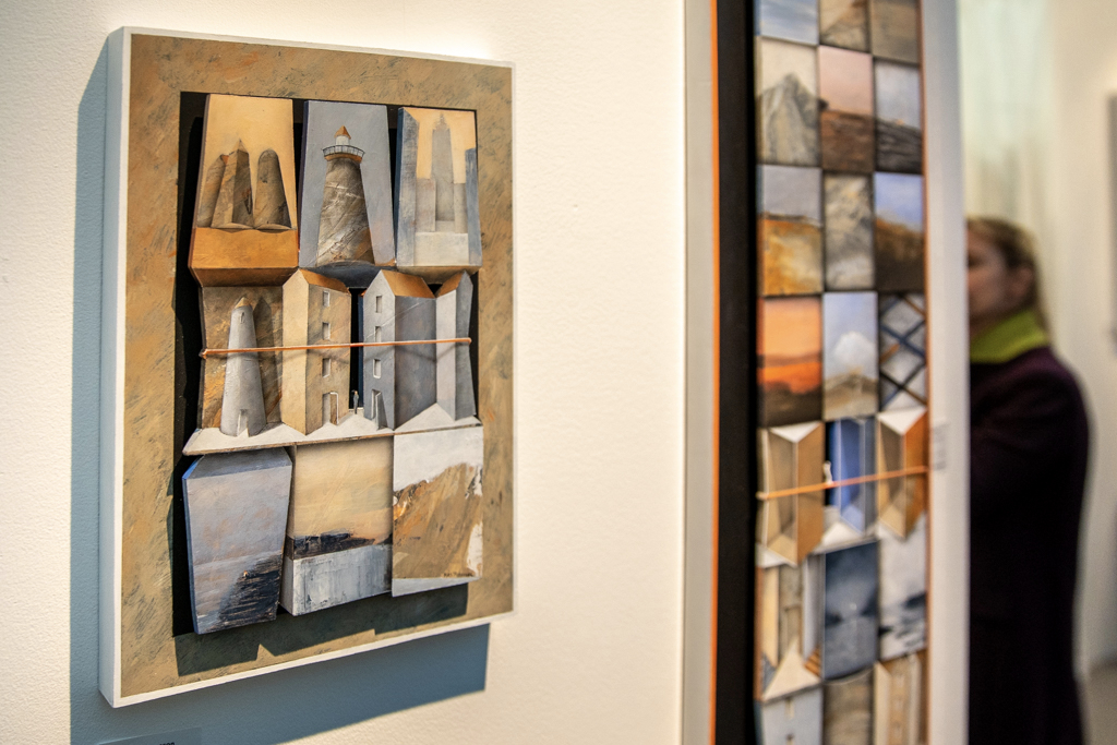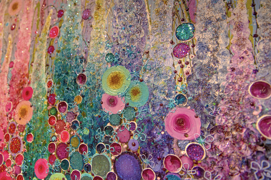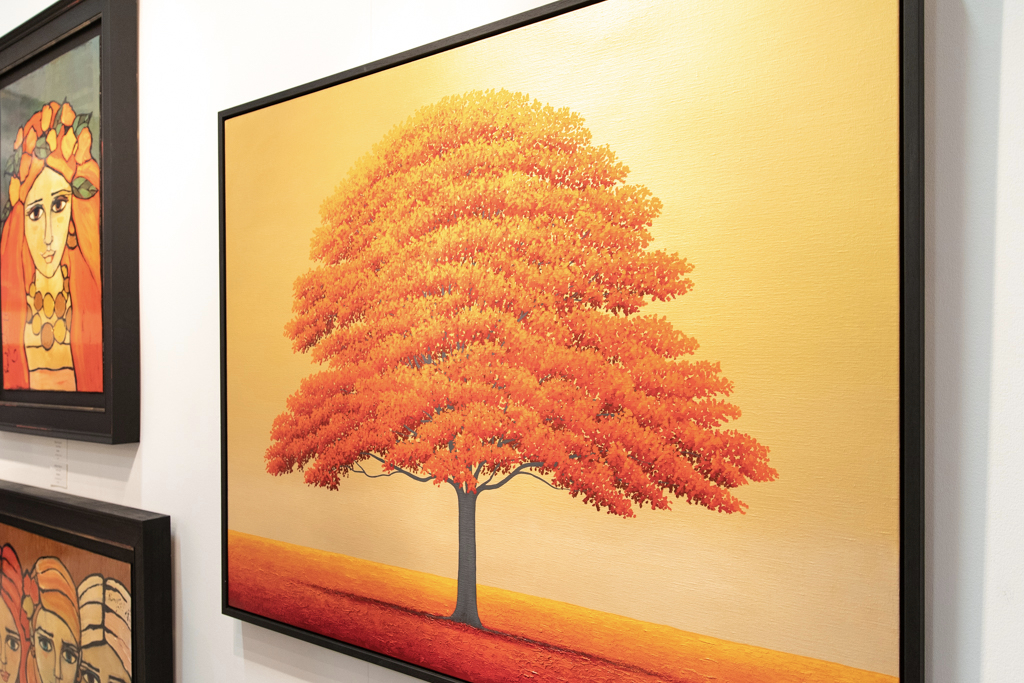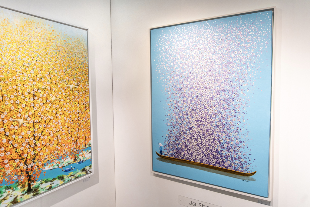 Quieter, but still featuring lively colours, is the series of nature-inspired works by Jen Shen, among which Meditation, in particular, draws attention for its bright oranges.