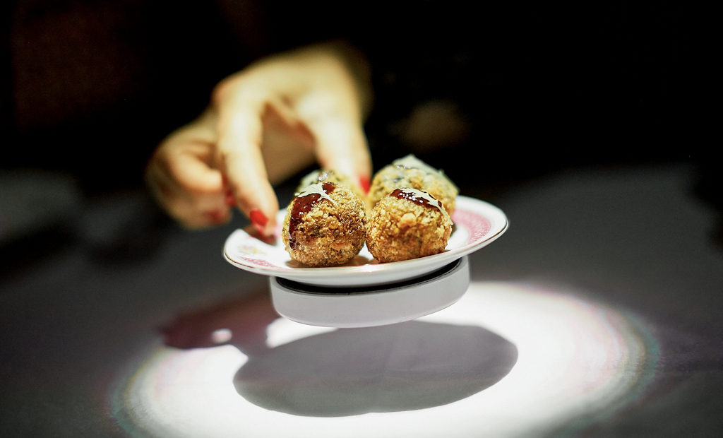 Act two is based on fear and serves up a hearty dish of white chickpea broth. Unfortunately, the tasks for this course get a bit lost in the narration, but you can expect plenty of dry ice and some LED disco light effects. This leads to the next part, which dramatically portrays the emotion of anger. Fiery flames surround each diner’s plate and tasty charcoal bun sliders with fresh crunchy slaw and tender chargrilled chicken are eagerly devoured. With a well-seasoned vegan bean burger option, and some cute chilli condiment dishes that enable you to “add your own anger”, this section is executed with perfection and easily showcases the precision of the 3D projection mapping.