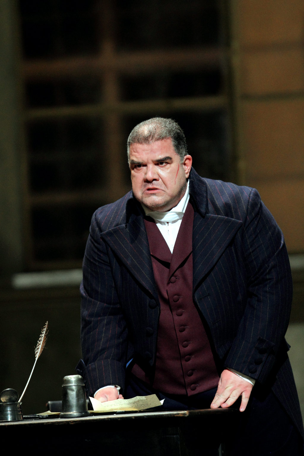 Maddalena di Coigny (played by American soprano Sondra Radvanovksy) is his lover, and their burgeoning relationship and its eventual tragic end dominate the story from the ending of the second act through to the final fourth. The strength of Radvanovsky’s portrayal lies more in her singing than acting, which at times straddle a fine line between believable and slightly over-the-top. Though her top notes are striking, her finest moments lay in the vulnerability of the more muted, softer notes. The chemistry she shares with Alagna is palpable enough, however they really shine together in their duets, with Alagna’s tenor and Radvanovsky’s soprano proving a gorgeous match.