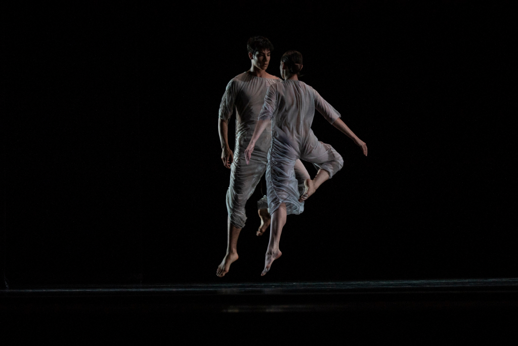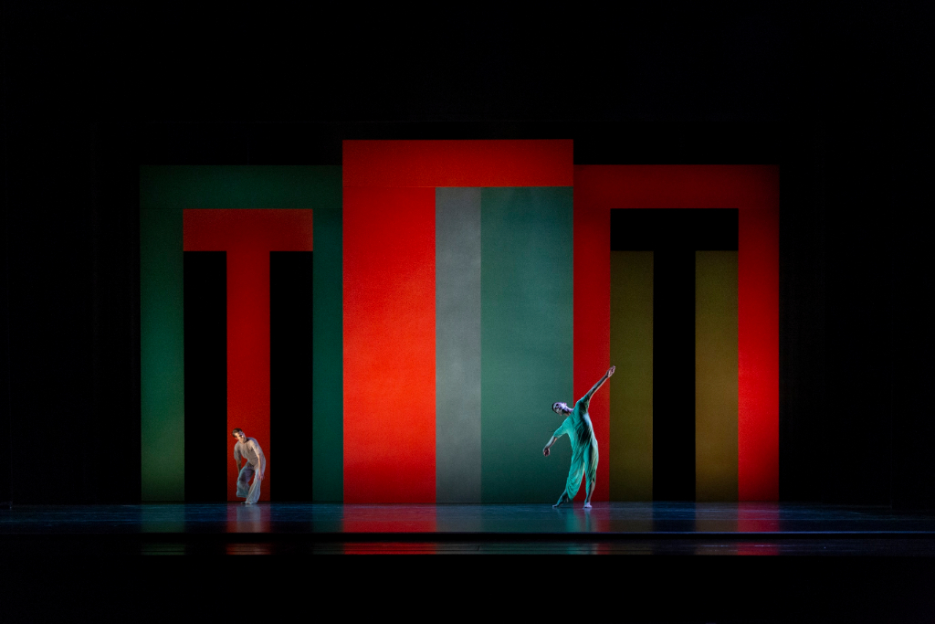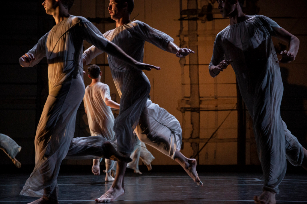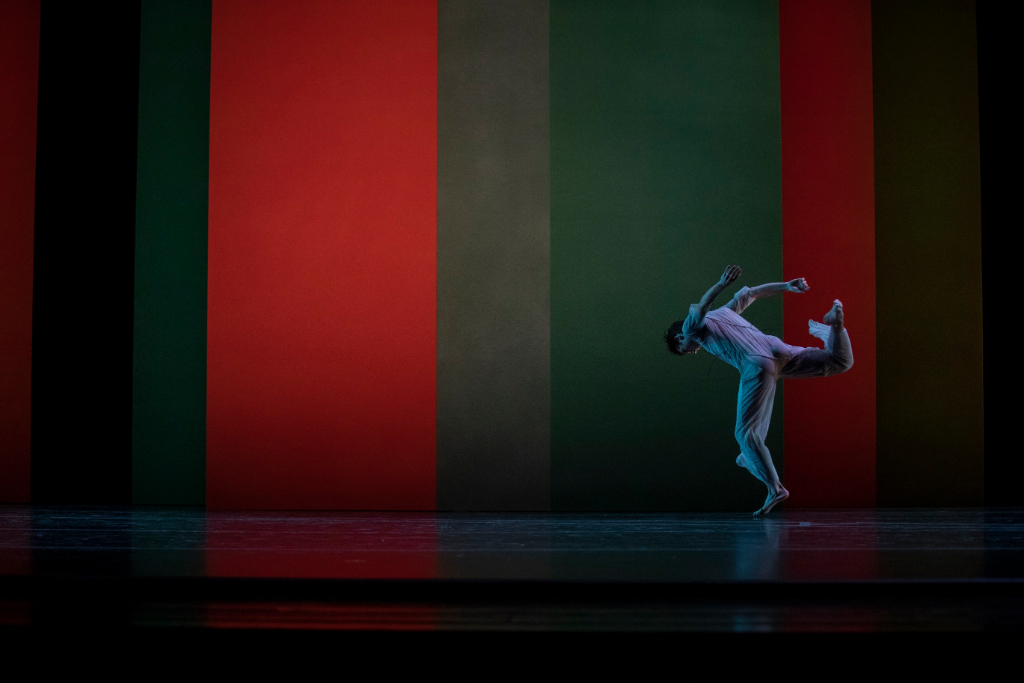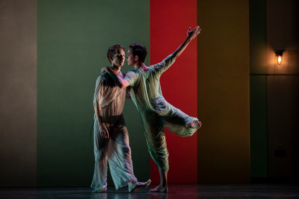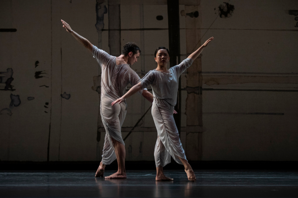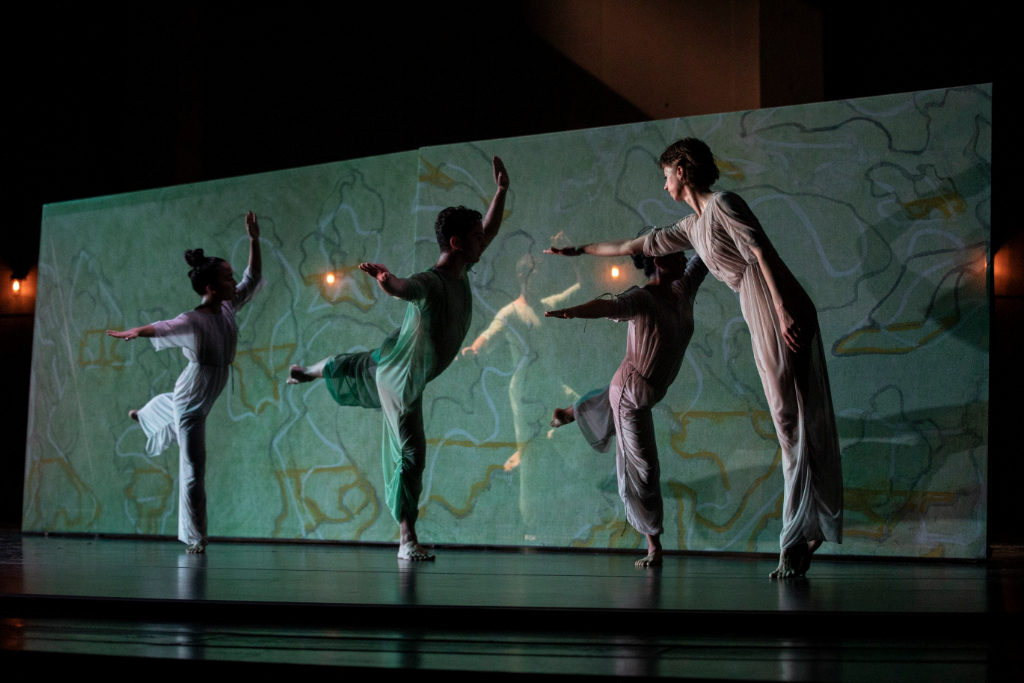 The dancers’ draped costumes, designed by Reid Bartelme and Harriet Jung, evoke classical statuary, giving them a sculptural presence in front of Marden’s modernist paintings. These specially made works act as more than simply scenery or backdrop; the dancers interact with them directly, pulling them across the stage or weaving in and out of the artist’s enormous canvases.