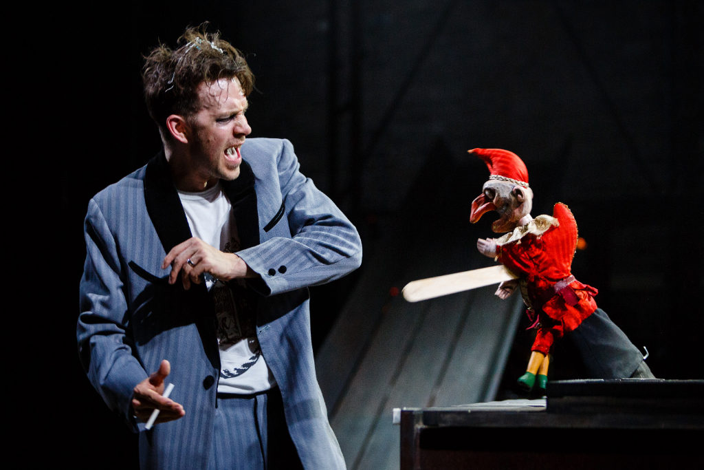 Based on The Beggar’s Opera, a farcical satire by John Gay, and “the most popular play of the 18th century”, Dead Dog in a Suitcase is written by Carl Grose and directed by Mike Shepherd in association with Liverpool Everyman and Playhouse. This reimagining stays true to Gay’s original of corrupt businessmen and politics in a time of disenfranchisement. Dominic Marsh’s likeable criminal Macheath is a womaniser and contract killer, first seen shooting Mayor Goodman and his dog; following Goodman’s death, his widow and voice of Reason (Patrycja Kujawska) runs for mayor. The production packs in a punch, from evil irritating puppets Punch and Judy directed by Sarah Wright, to epic smoke and fire, and brilliant musical numbers courtesy of composer Charles Hazlewood, which range from electro disco, new wave, dubstep, country and soul – standout renditions are Massive Attack’s Angel and a ska track similar to Madness. Michael Vale’s set design is a sight to behold, with a large climbing frame on stage (typically the type found in schools), with a slide on the left, and spiral staircase stage right.