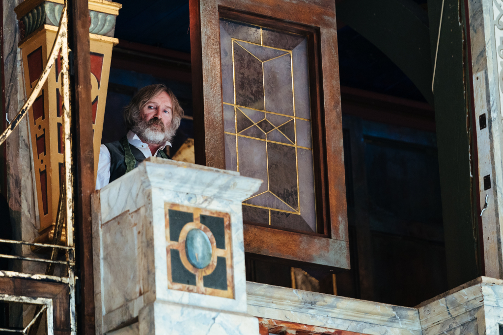 Pearce Quigley plays a compelling Falstaff, a fat knight who arrives in Windsor short on cash. Quigley’s delivery is impeccable: he shines and carries tonight’s performance along with lustful swagger. To acquire wealth, Falstaff decides to woo one of the rich wives of Windsor, Mistress Page (Sarah Finigan) and Mistress Ford (Bryony Hannah). But which one? Falstaff writes almost identical letters to both, inviting them to frolic; but when the knight’s ignoble ways turn his servants against him, the wives learn of his underhanded plot. Together, they unite to play a joke at his expense – unbeknownst to jealous Master Ford (Jude Owusu), who distrusts his wife. Meanwhile, Mistress Page’s daughter Anne is hounded by suitors. Her mother wants her to marry Caius, a French physician (Richard Katz); her father’s pick is the oafish, unromantic Slender; and Anne herself is in love with Fenton. This is a lot to untangle, but over the course of two and a half hours the characters and their accompanying motivations emerge with natural vivacity.