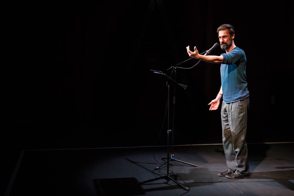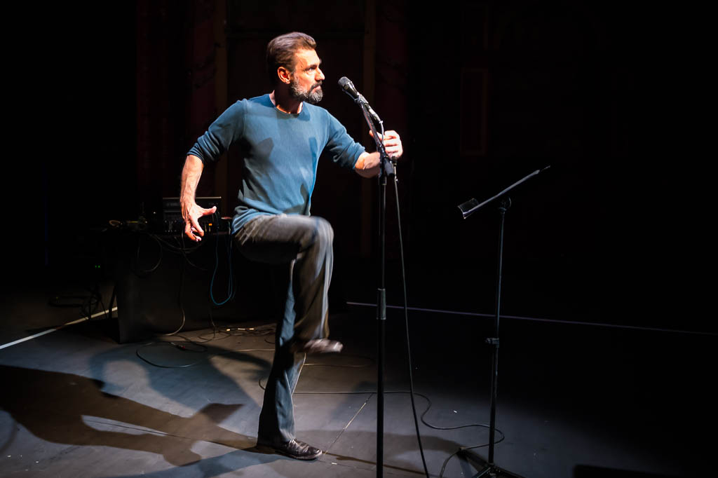 The performance closely observes the original Shakespearean tragedy of Hamlet, with well-known lines, “To be, or not to be: that is the question” and “Adieu, Adieu, remember me” woven into the text, while characters like Hamlet’s friend, Horatio, and the Gravedigger appear in his delirious exchanges with apparitions. Soundscape visionary artist G U P Alcaro accompanies Gifuni on stage, his sound desk expertise adding music and a cacophony of sounds that help bring the actor’s words to life.