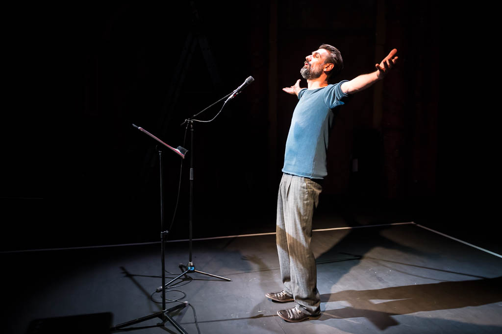 Gilfuni is completely consumed with the characters. His whole body moving with his sense of madness, between make-believe Rosary bead kisses, upward gazes to ghosts of Hamlet’s past and peculiar clucking, chicken sounds, he moves his voice between different characters, from soft whispers to reverberating tremors that fill the auditorium.