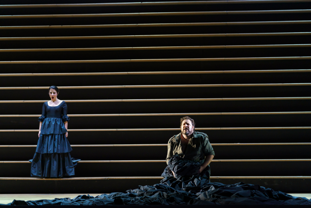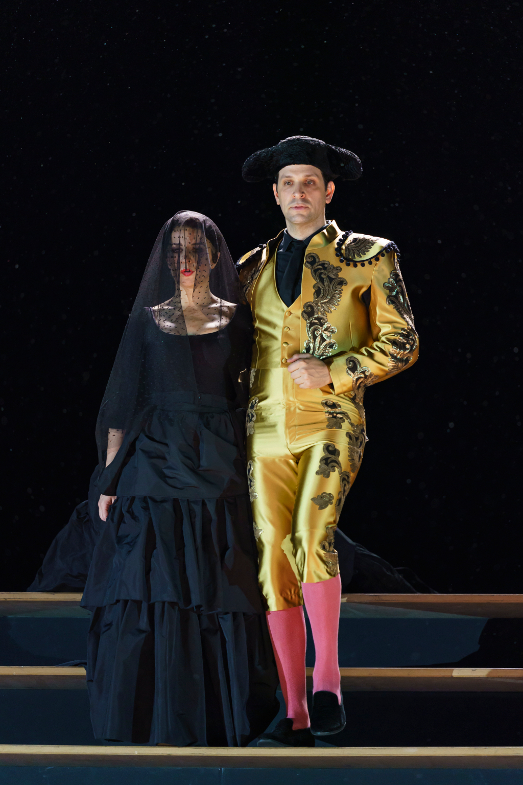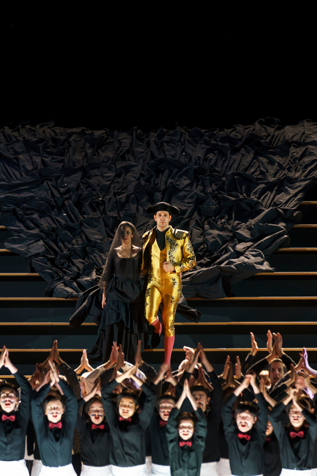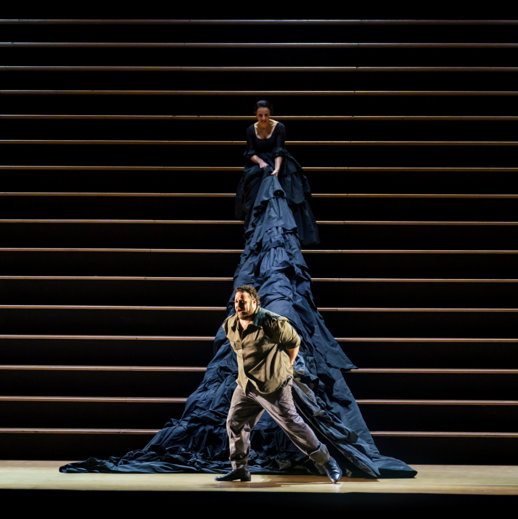 The space is then immediately occupied by a large group of women who come to embody one single model of a sexually enticing woman, the ideal of which is Carmen, for whom all the men lust. The crude representation of the starved desire of the men becomes a spectacular display along the stairs in Katrin Lea Tag’s design, which here signify the arena from which to view another performance – that of the lives of audience members gathered for the familiar space of a recognised and loved piece.