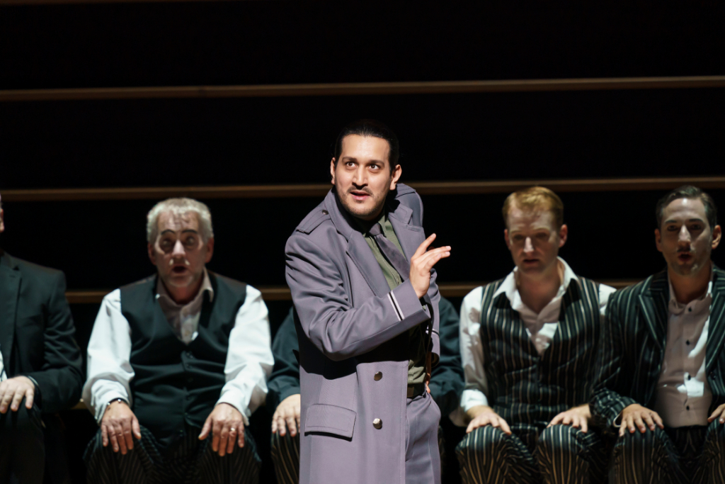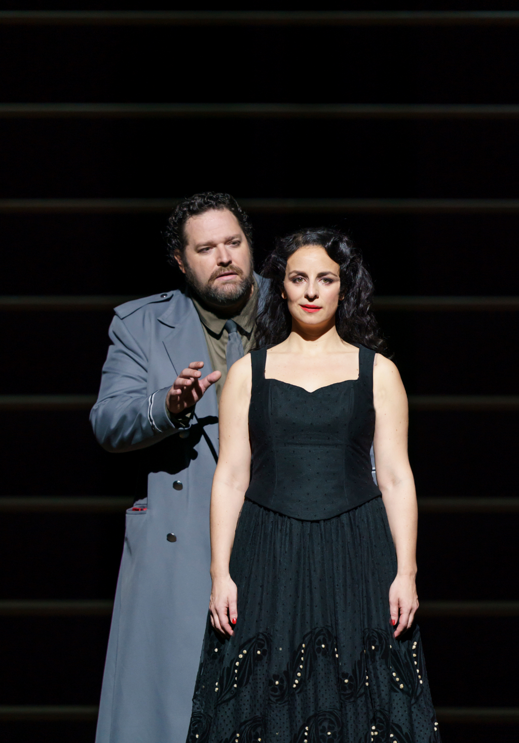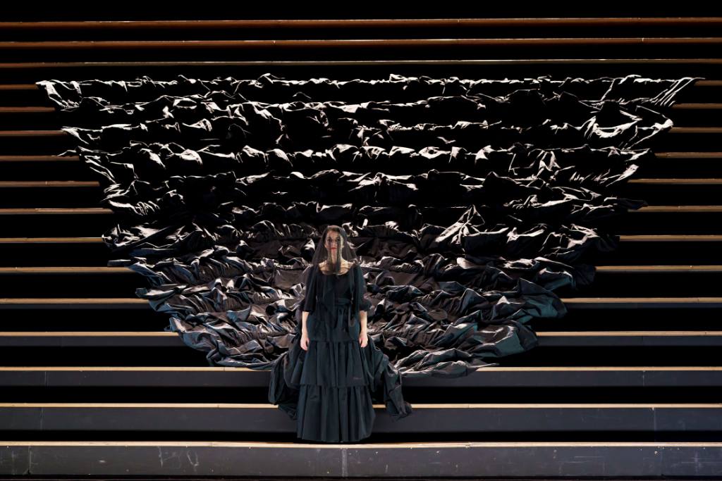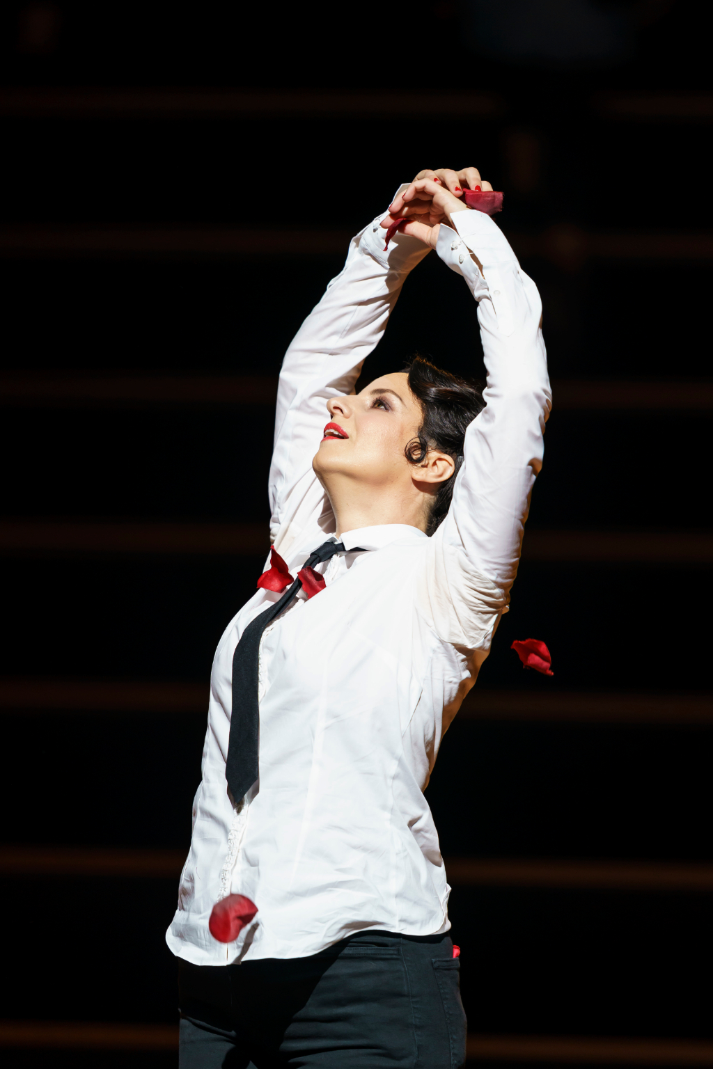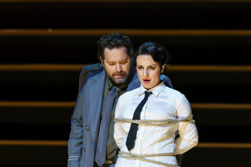 The space is then immediately occupied by a large group of women who come to embody one single model of a sexually enticing woman, the ideal of which is Carmen, for whom all the men lust. The crude representation of the starved desire of the men becomes a spectacular display along the stairs in Katrin Lea Tag’s design, which here signify the arena from which to view another performance – that of the lives of audience members gathered for the familiar space of a recognised and loved piece.