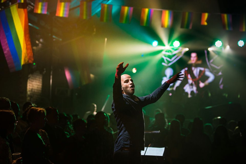 London’s LGBT+ chamber choir, the Fourth Choir, conducted by Dominic Ellis-Peckham (with a rainbow flag painted on his head), performed choral pieces, which were interspersed with readings. The singers were dressed sharply in blacks and oranges and moved confidently amongst the crowd throughout the show.