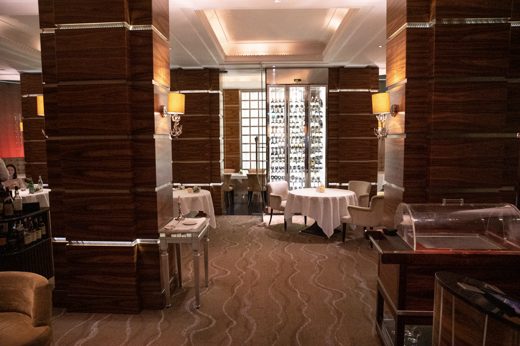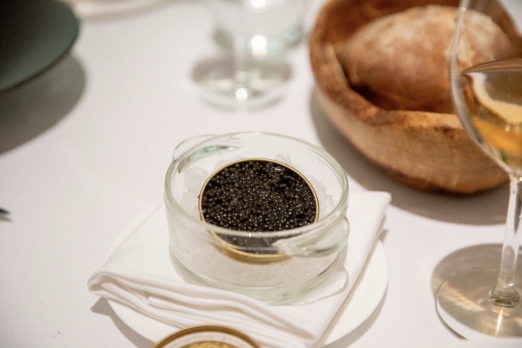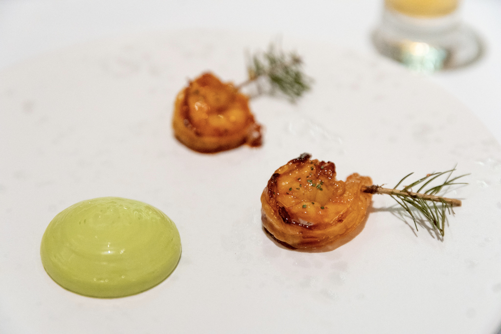 The amuse-bouches and a glass of champagne by Nicolas Fetizon (mostly pinot noir, which makes it sharper and more structured) kick off our dinner with delight. The little crab tartlets with caviar stand out from the assortment.
