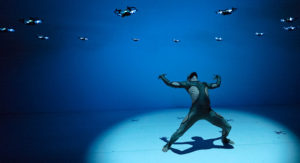 The opening piece sees a dancer “duet” with a set of drones that hover above and around him as he moves, creating different shapes and formations. Then there is Flyland in a Room, the dance of a couple coming together and then falling apart. It features projected images of a virtual reality that the dancers move in synch with until they seem to float and fly. For most of the show, perfomers are mirroring projected, pre-recorded images of themselves in the background, as moving graphics create dream-like settings. There are moments when this works very well and the effort of the dancers and technicians results in charming passages. In the final piece, Game Engine, the troupe assemble cubes with fast-moving travelling sequences to emulate the creation of a computer.