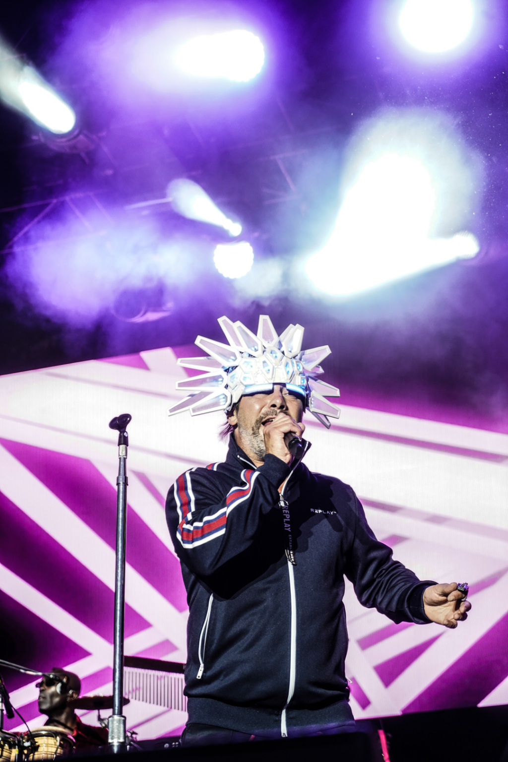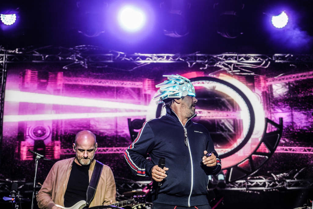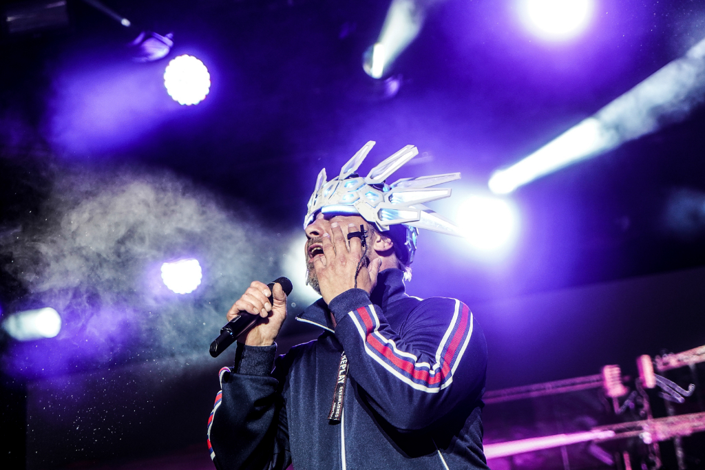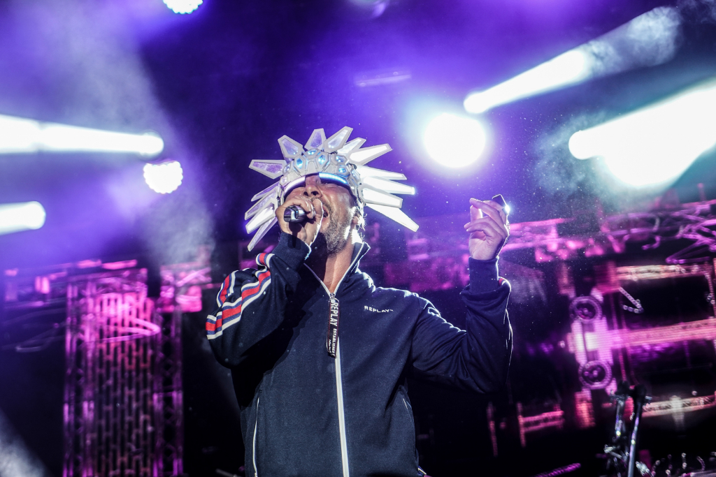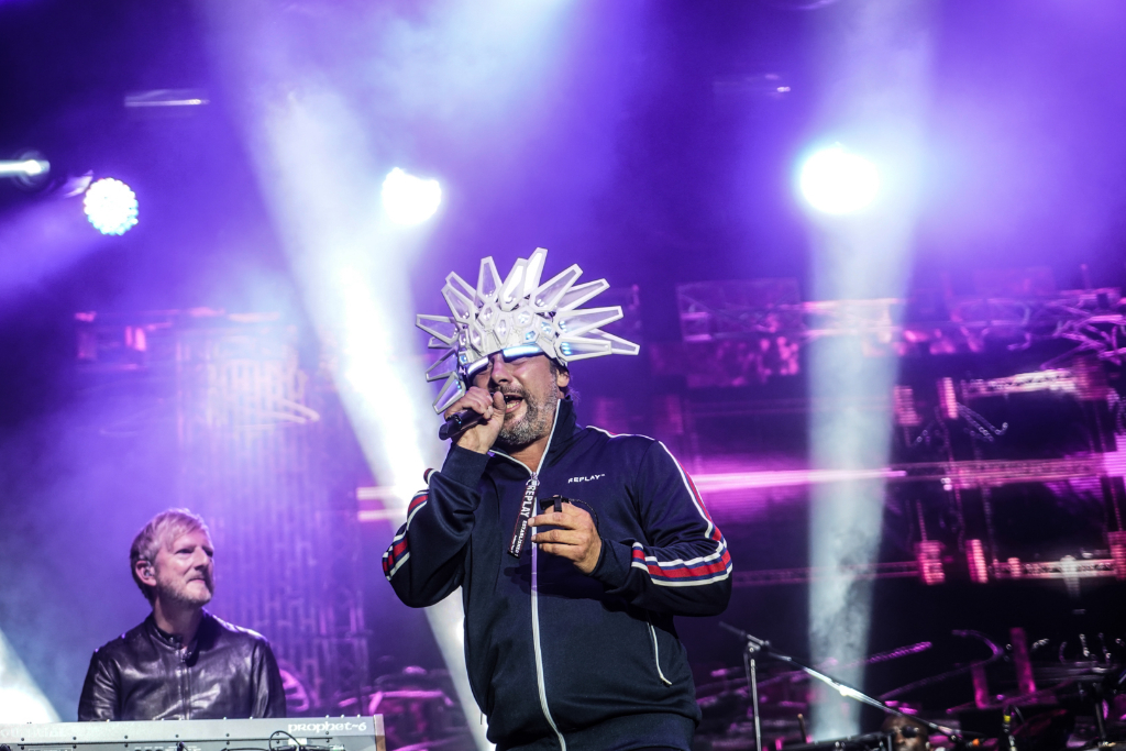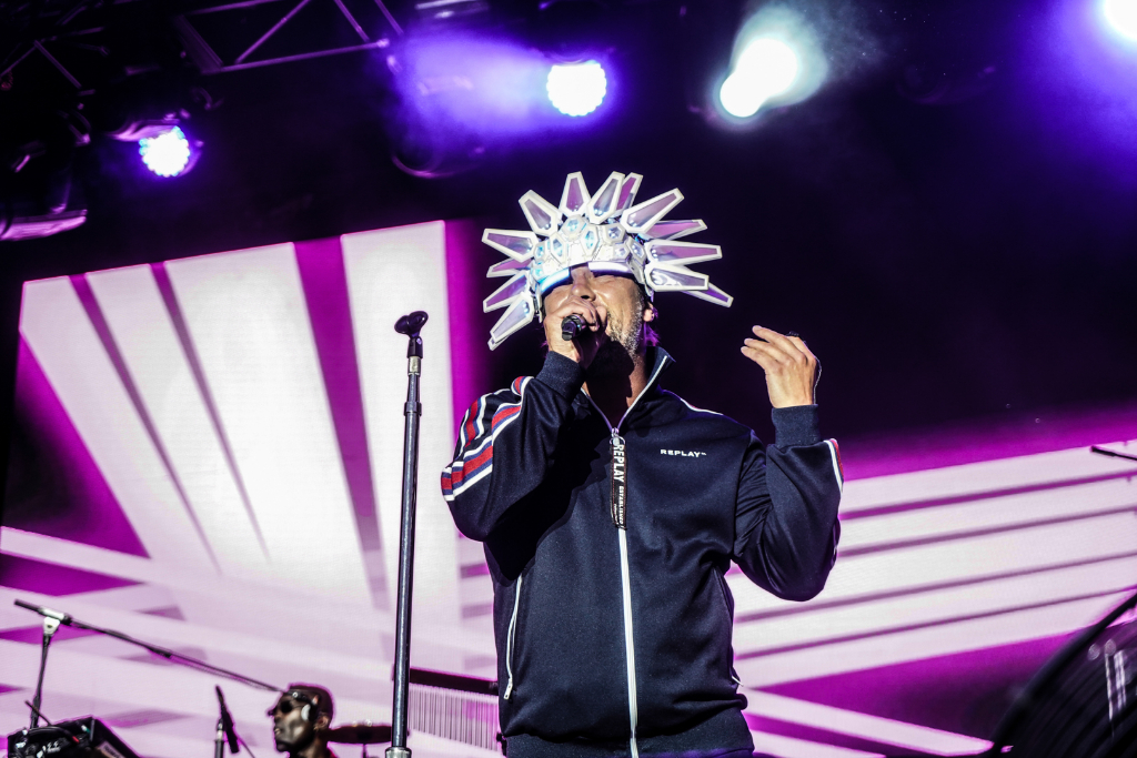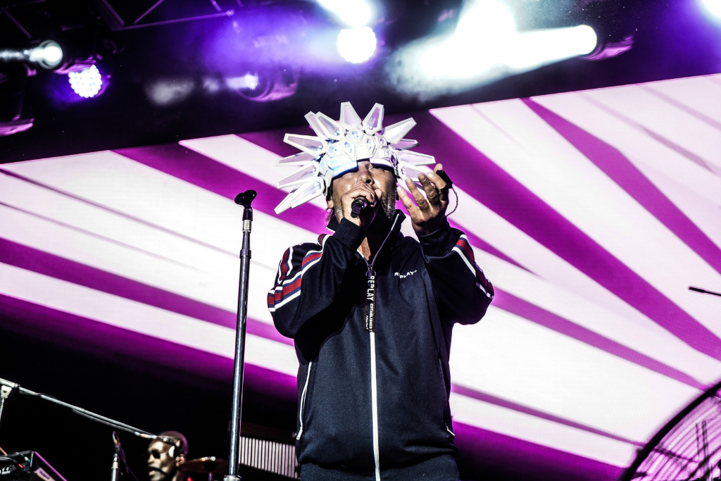 The acid jazz legends quietly slink into their places, but then frontman Jay Kay boisterously approaches the stage with the same glowing headpiece he wore at Coachella. The gear features colours that nicely change alongside the components of each composition, beginning with Shake It On, and are a supplement to the computerised aesthetic created by synths and graphics.