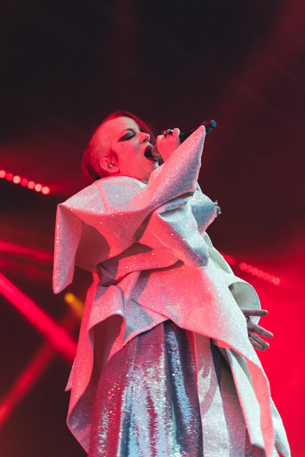 Manson, though, doesn’t seem to have aged at all, appearing in a jacket that made her look like a sequined, 3D Tetris shape. This apparition was magnetic. The Tetris number was swiftly jettisoned for a silver sequined dress that moved like fluid as Manson stalked the stage. Bandmates Butch Vig, Steve Marker and Duke Erikson created a shimmering sound that was matched by some great lighting: pulsating violets and blues to Version 2.0 orange to strobes for the encore.