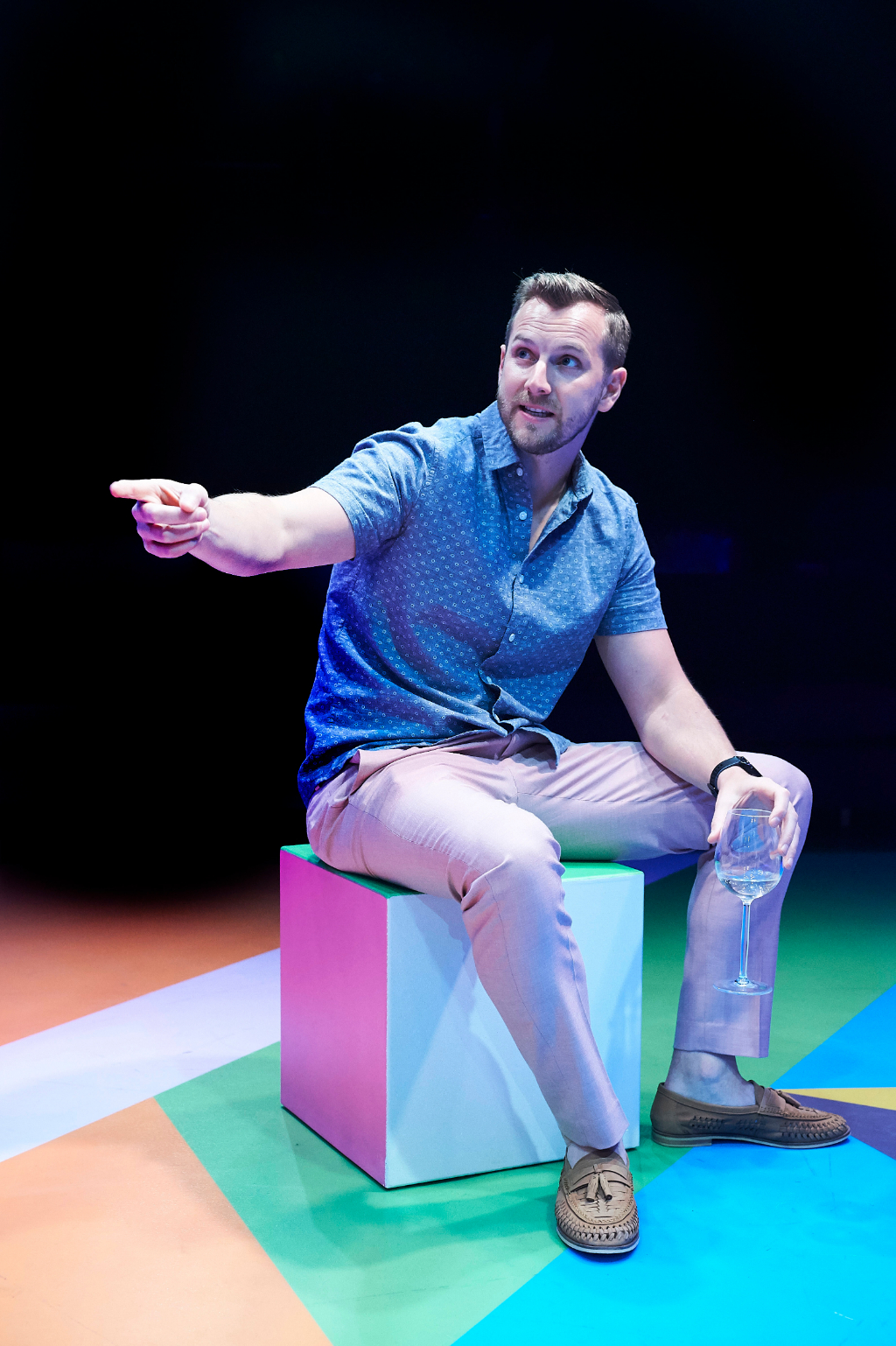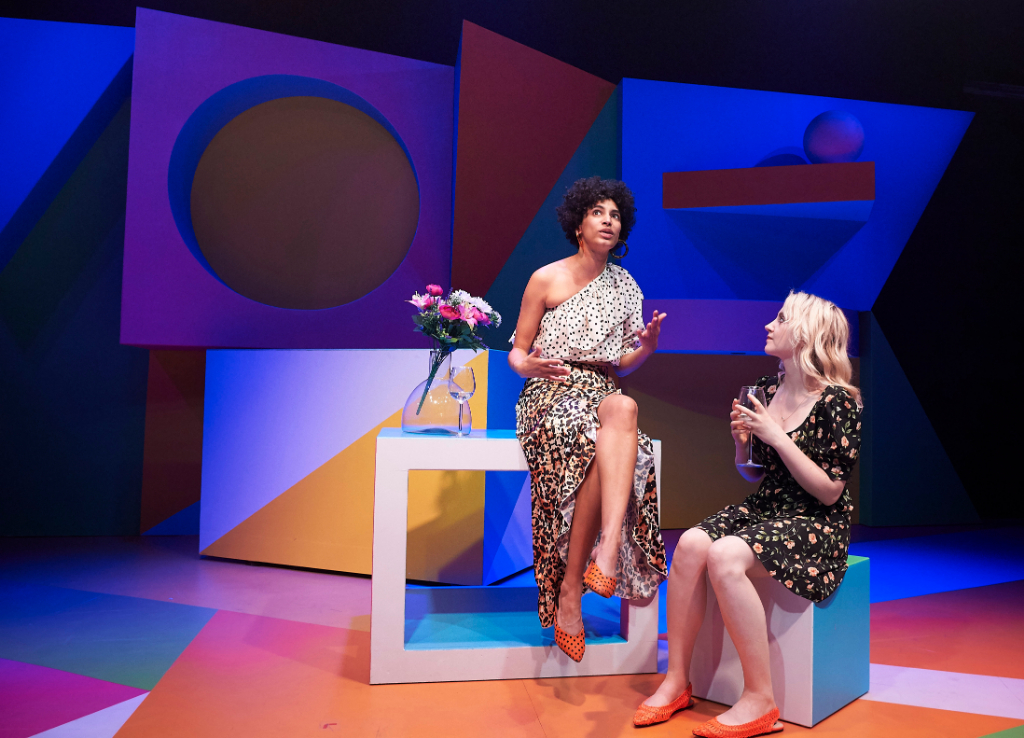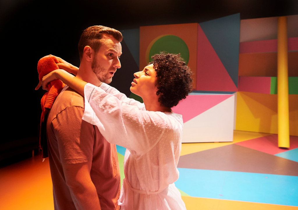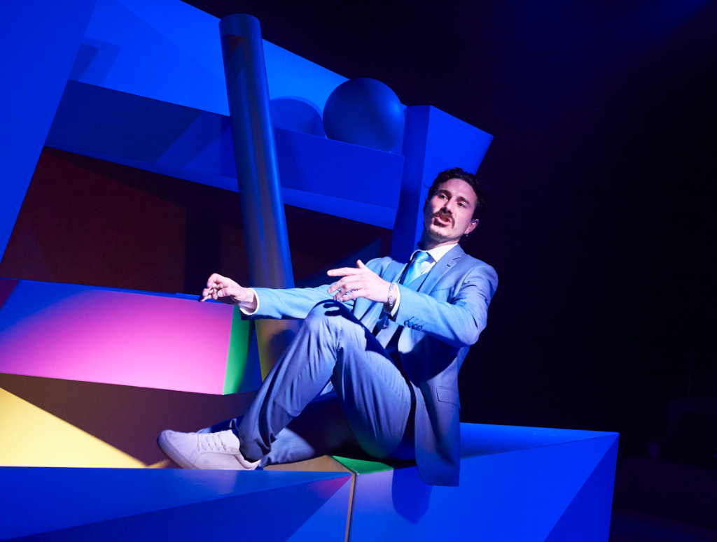 The Vaults Theatre space is a curious setting for the production. The underground venue beneath Waterloo station doesn’t quite seem to fit, and together with Matt Haskin’s frequent use of red/blue lighting and Simon Scullion’s wacky set design – reminiscent of a 90’s children’s game show but like, on acid – it all doesn’t make much sense.