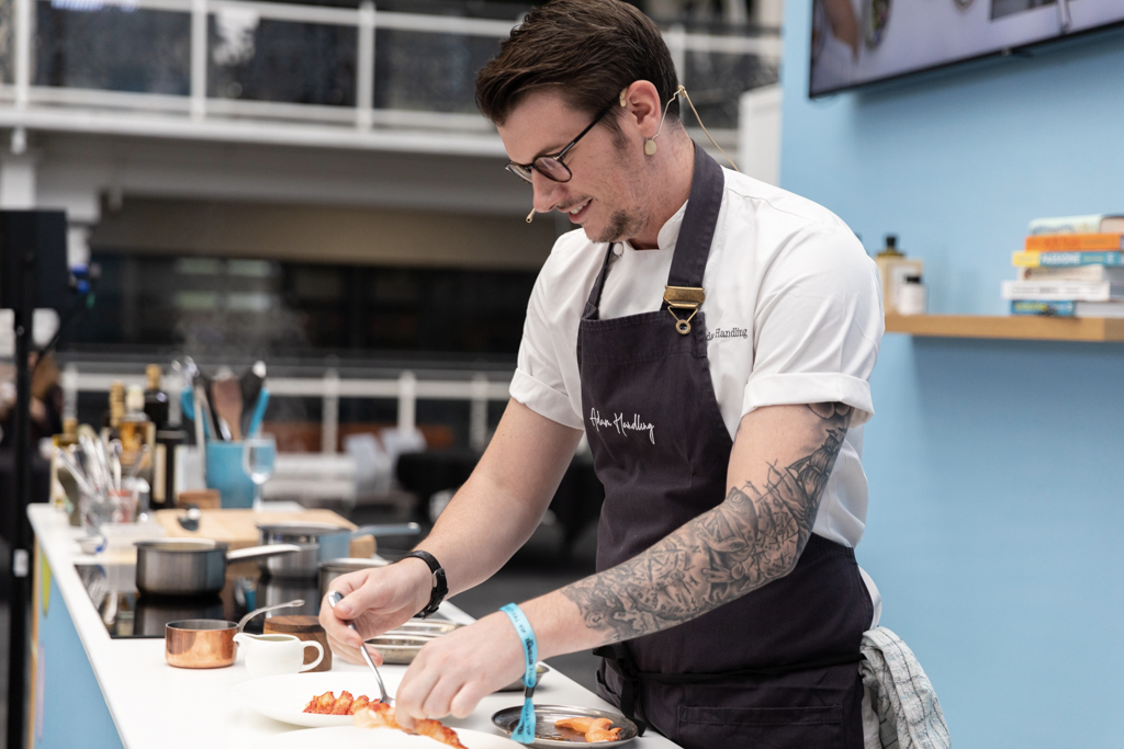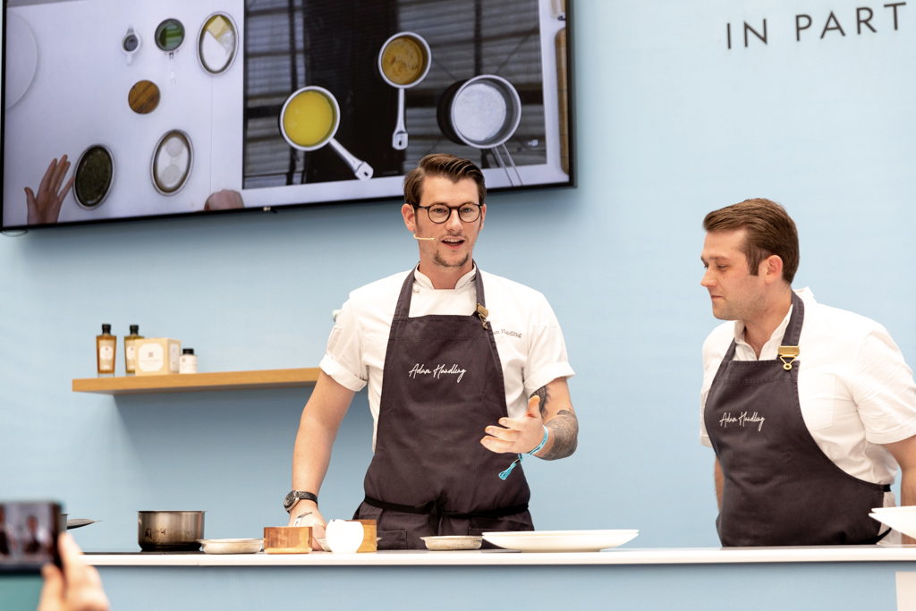 Later in the day, homegrown hero Adam Handling graces the same platform. He picks three dishes from the tasting menu of his flagship restaurant in Covent Garden, the first being a lobster – one of the chef’s favourite types of seafood to work with (especially the Scottish one, just like him) – cooked with wagyu beef fat. “You need to prep in the kitchen, just like in life,” says Handling while showing how quickly he can put together the ingredients on the table, smoothly stirring the pan and then clearing up what is left to be reused for decorations.