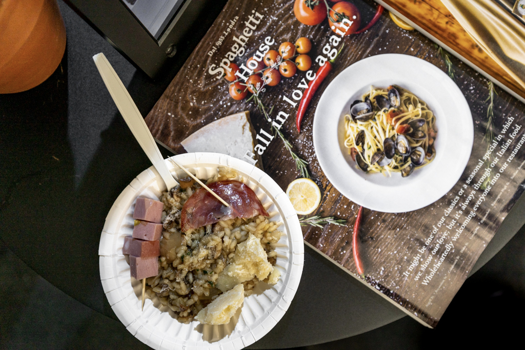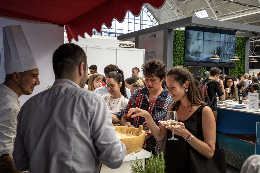 Among the international isles, there is space also for national produce. Bringing to the table the lean, well-seasoned meat of the north, the Cumbrian Sausage Company is present to make succulent hot dogs on the spot with their renowned product. Yorkshire-born twins Charlotte and Jennifer Davison are also not that difficult to be found with their display of colourful bakes: from the attractive brownies – which immediately disappear soon after the opening of the festival door’s – to less common recipes like the chocolate and orange cupcake. It’s easy to detect one of the longest queues under the pavilion: ham-loaded trays and a wheel of Grana Padano signal the stall of Spaghetti House. The Italian restaurant chain, established over 60 years ago, provide simple, fresh ingredients, such as mortadella, as well as delicious spoonfuls of risotto.