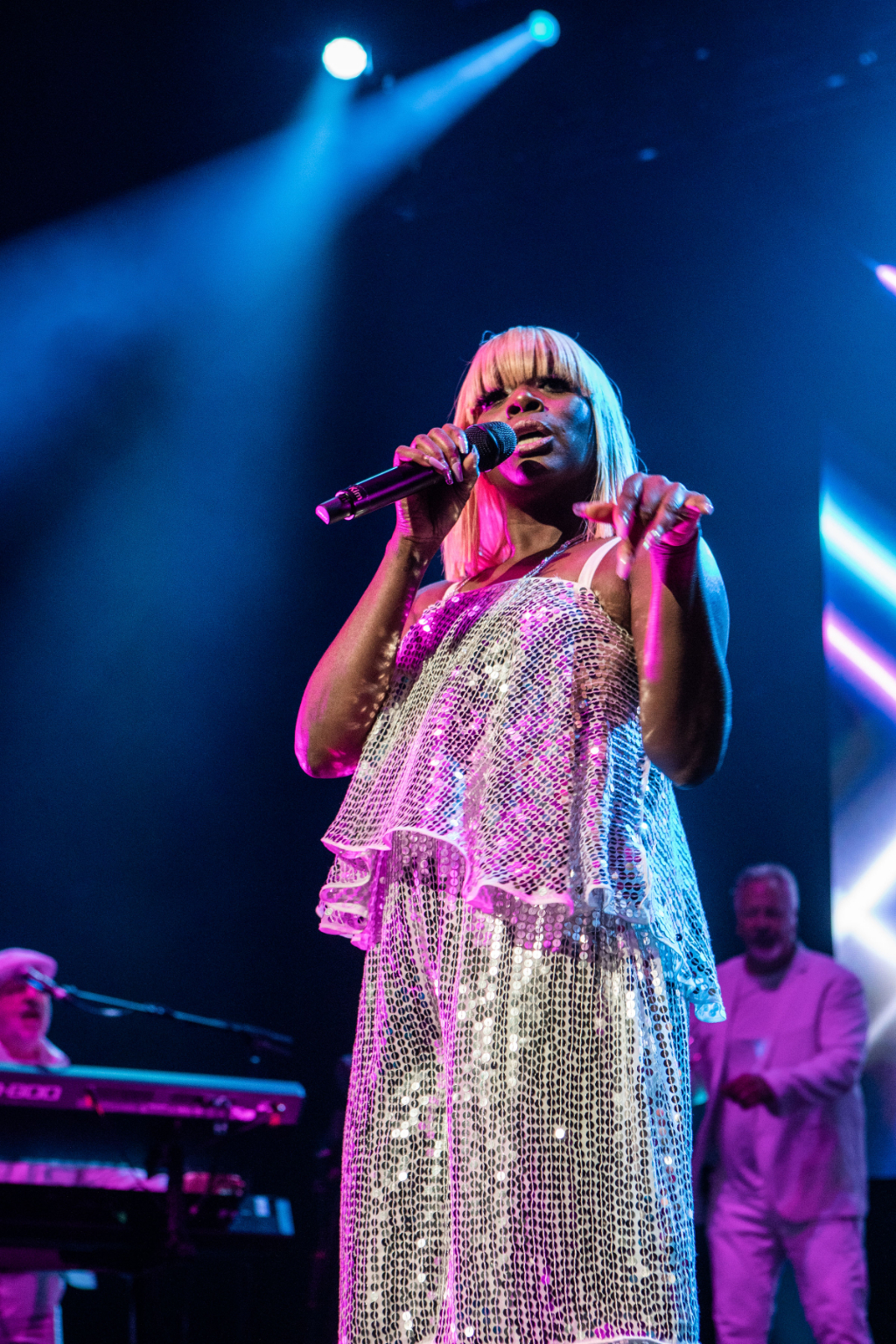 As well as lead guitarist, Rodgers is on vocal duties, supported by singers Folami and Kimberly Davis, who fill in for Diana Ross (I’m Coming Out, Upside Down), Sister Sledge (We Are Family, Lost in Music) and other associated acts in this jukebox of hits. Their belting vocals impact the weathered eardrums of this mostly Gen X crowd.