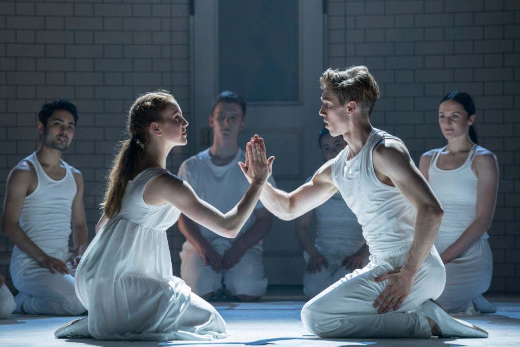 New Adventures’ magnificently dynamic production features breathtaking dancing expressed with captivating emotion and passion. An intriguing rendition of Prokofiev’s music (Terry Davies) intensifies an Orwellian atmosphere of suspense and uncertainty. A powerful Dance of the Knights opening the show to a procession of white-costumed drone-like youths in formation evokes repressed adolescent sexuality.